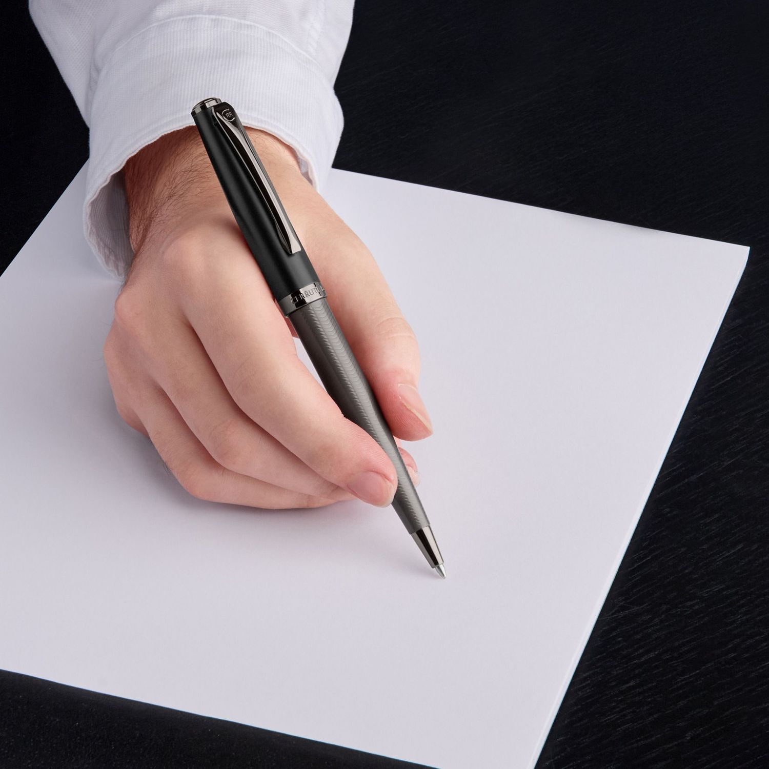 To pióro kulkowe z serii Cerruti 1881 Islington charakteryzuje się wyrafinowanym wzornictwem z matową czarną skuwką, która subtelnie kontrastuje z matową brązową dolną częścią korpusu ozdobioną misternymi detalami w kształcie szewronu. Smukłe i funkcjonalne pióro jest wykończone logo CRR na klipsie, oferując nowoczesny akcent w ponadczasowym instrumencie piśmiennym.