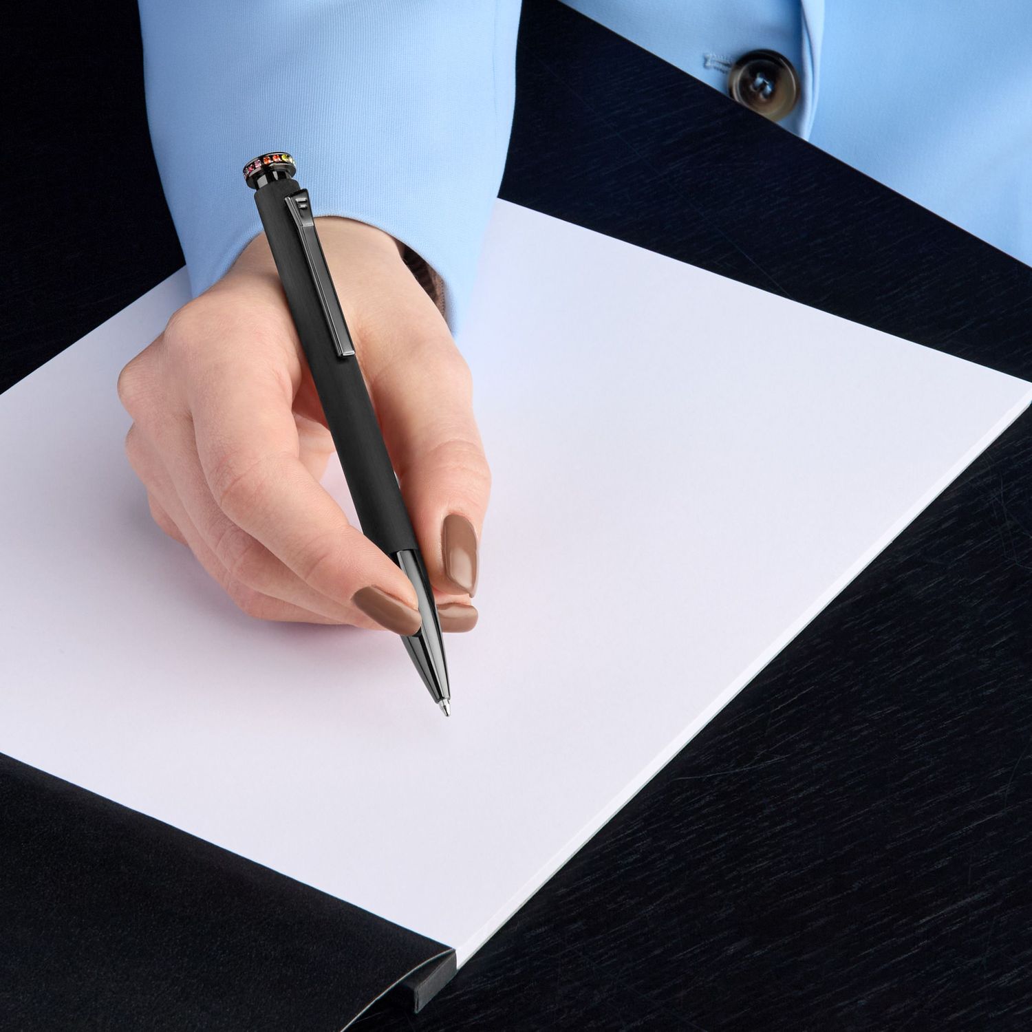 Pióro kulkowe Mademoiselle Black na nowo definiuje wyrafinowanie dzięki odważnemu, ponadczasowemu wyglądowi. Eleganckie czarne wykończenie pięknie kontrastuje z żywą, tęczową koroną z kamieni, inspirowaną najlepiej sprzedającym się zegarkiem Festina z tęczowymi kamieniami. Charakterystyczne elementy projektu, w tym delikatnie teksturowane pierścienie i kultowy klips F, podkreślają dbałość Festiny o szczegóły i kunszt. Łącząc w sobie elegancję, funkcjonalność i blask, to pióro jest doskonałym elementem wyrazu z przyjemnym akcentem żywych kolorów tęczy.