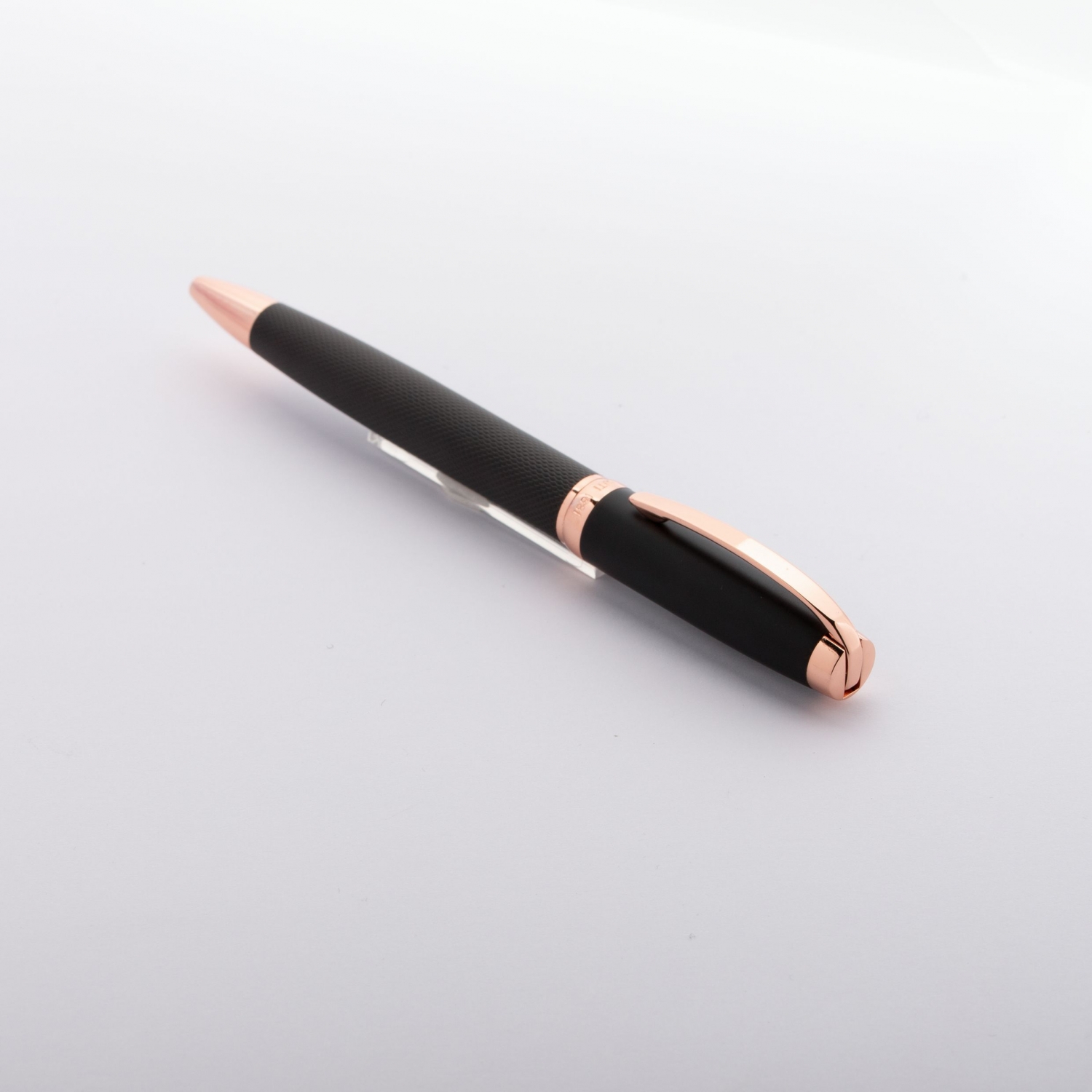 Od delikatnej, matowej, czarnej, lakierowanej nasadki po wygrawerowany korpus w kolorze czarnego diamentu i ozdobiony błyszczącymi, różowo-złotymi lamówkami, długopis Myth jest pełen kontrastów, co nadaje mu luksusowy i nowoczesny wygląd.