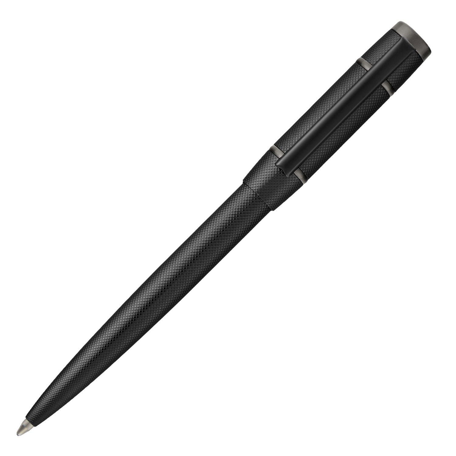 The Rive ballpoint pen expresses a modern, graphic design language that showcases the new Double B logo through controlled contrasts of metal finishes. Its tight diamond-cut surface is set against smooth black and gunmetal trims, logo, and accents, creating a sharp, architectural presence. The 3D Double B logo adds depth and precision, while the HUGO BOSS logo at the top signs the piece with a refined, contemporary edge.