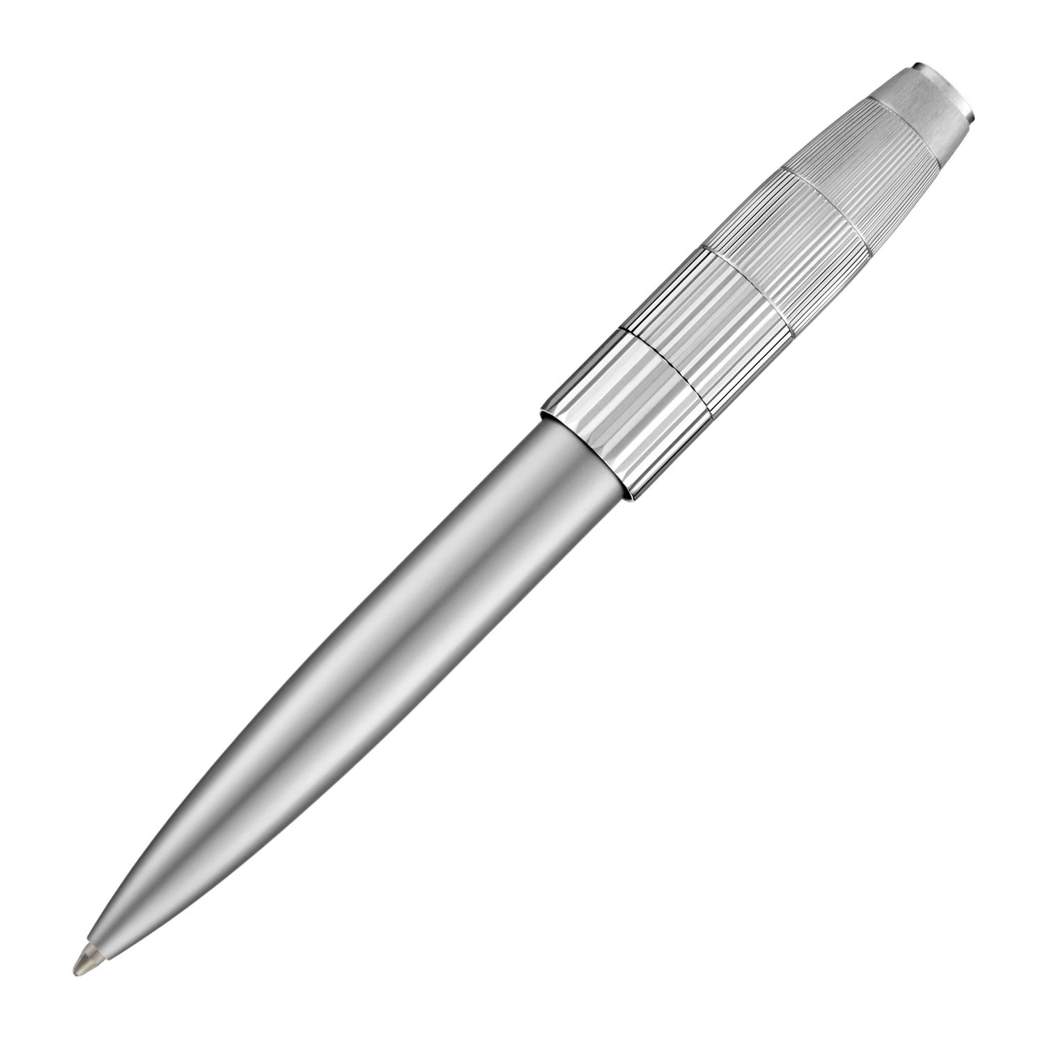 The Striato pen line celebrates the graphical play on stripes that defines the collection, interpreted here in its most luxurious expression. Its generous, sculptural silhouette is crowned with an oversized cap wrapped in a pattern of progressively tightening pinstripes, creating a sense of movement and visual precision. The result is a resolutely luxurious writing instrument with a distinctive graphical twist, where refined pattern work meets timeless elegance. This ballpoint pen in all crisp chrome, with matt & shinny contrasts is a true expression of contemporary luxury, outfited with a large & signature HUGO BOSS nib.