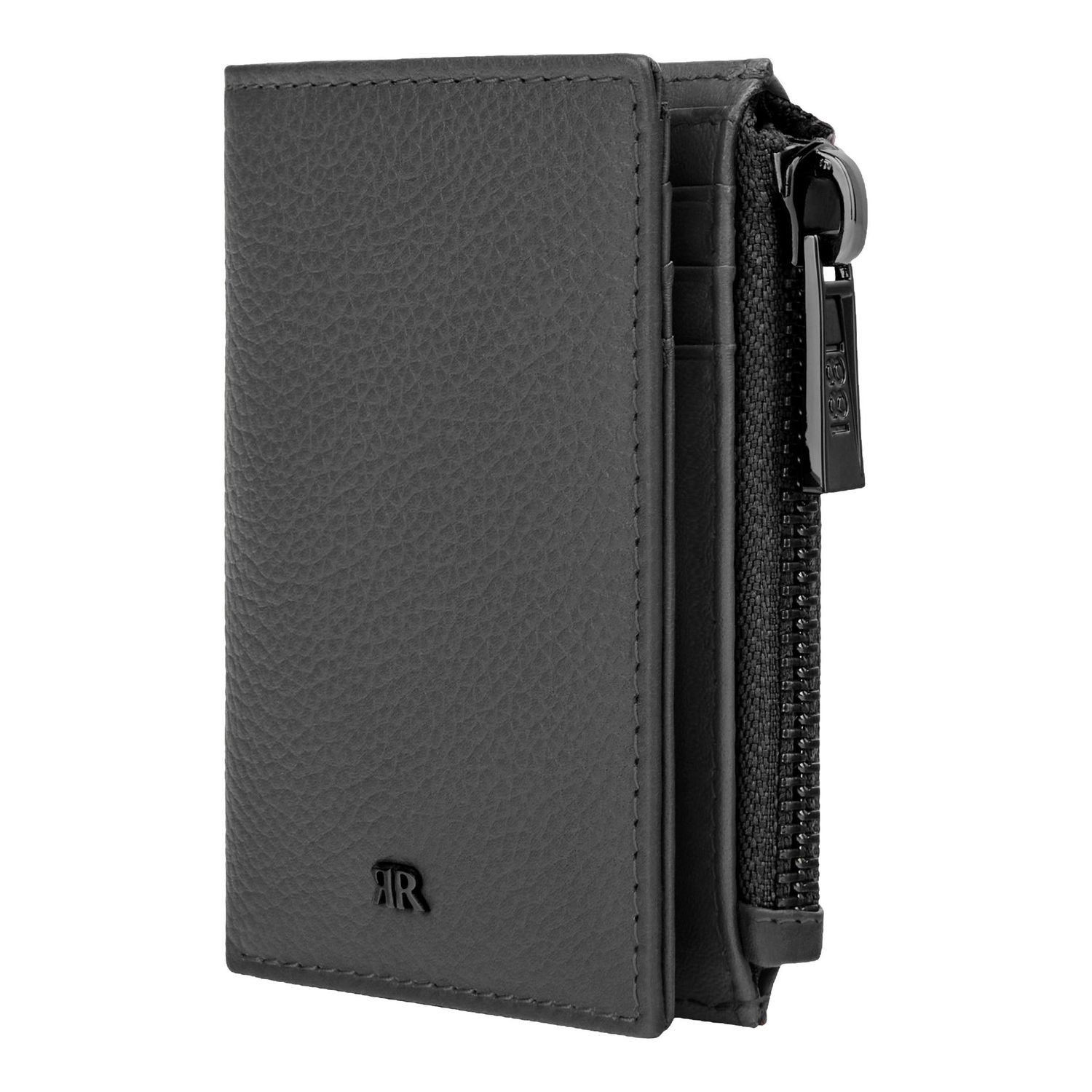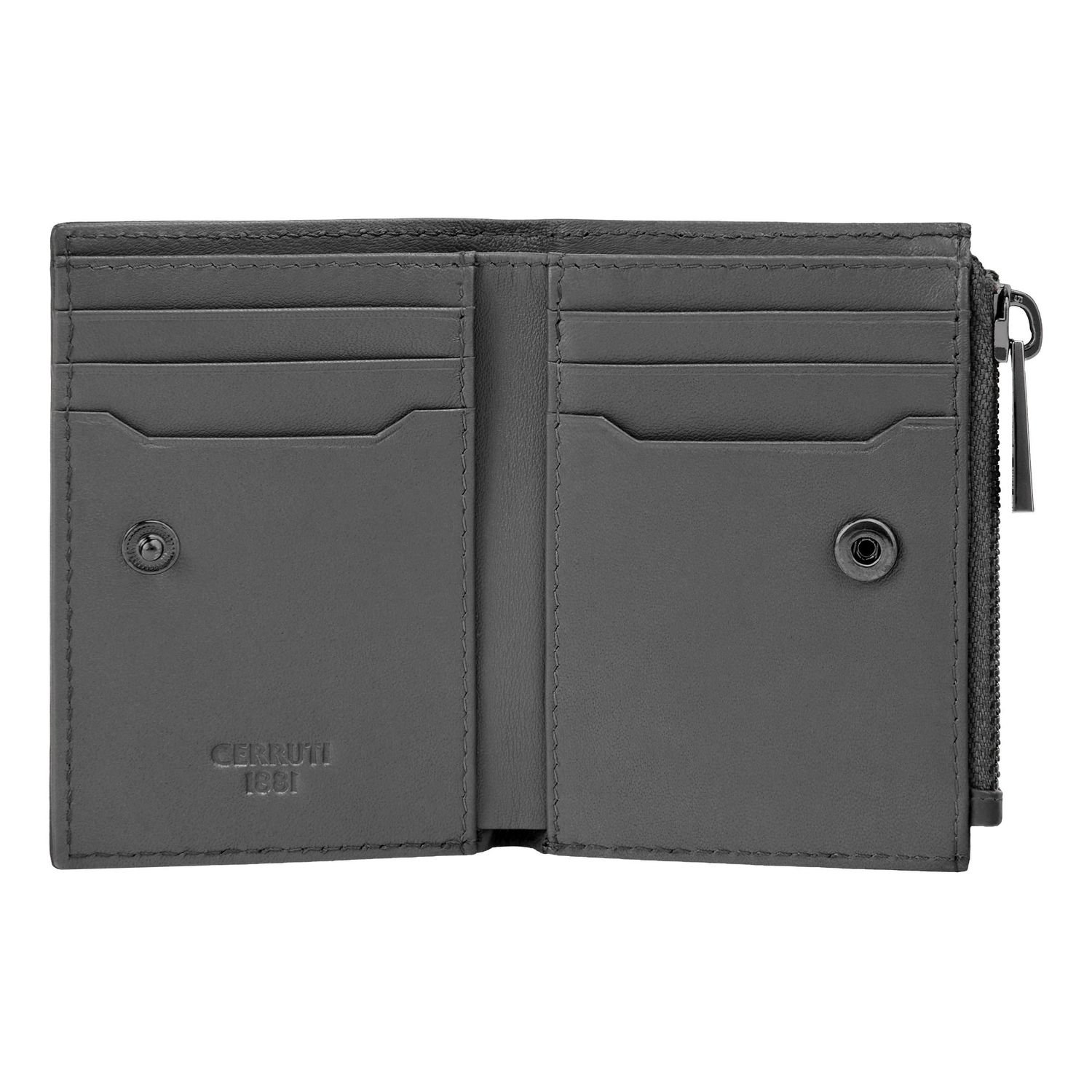 The CERRUTI 1881 Jefferson zipped card holder is compact and highly functional, offering six card slots, two vertical compartments, a main note compartment, and a zipped pocket housed in an impressively compact volume. Crafted in carefully selected grained, best-quality leather, it delivers durability and a refined tactile feel. The metal accents elevate the design: the 1881 zipper puller serves as a luxurious detail, while the miniature double signature in gunmetal blends seamlessly with the tonal grey leather, creating an understated, minimal, and quietly luxurious expression.