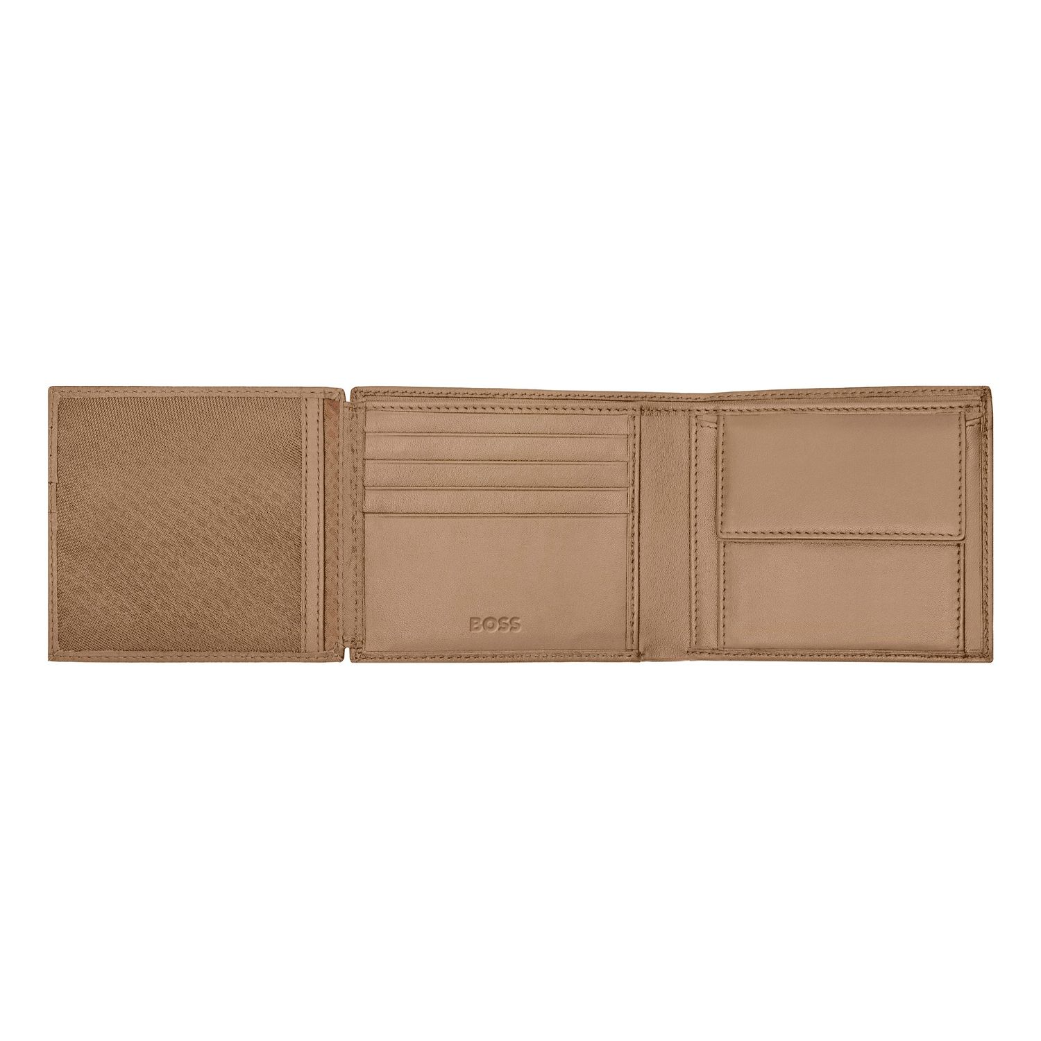 Ten składany portfel z kieszenią na monety jest wykonany ze starannie dobranej, najwyższej jakości skóry wielbłądziej. Jest ozdobiony luksusową chromowaną tabliczką z podpisem BOSS i posiada wewnętrzną podszewkę z monogramem. Portfel zawiera: 2 przegrody na waluty 8 miejsc na karty 3 boczne przegródki 1 miejsce na monety Zgodnie z DNA marki BOSS, jest prosty, funkcjonalny, elegancki i minimalistyczny.