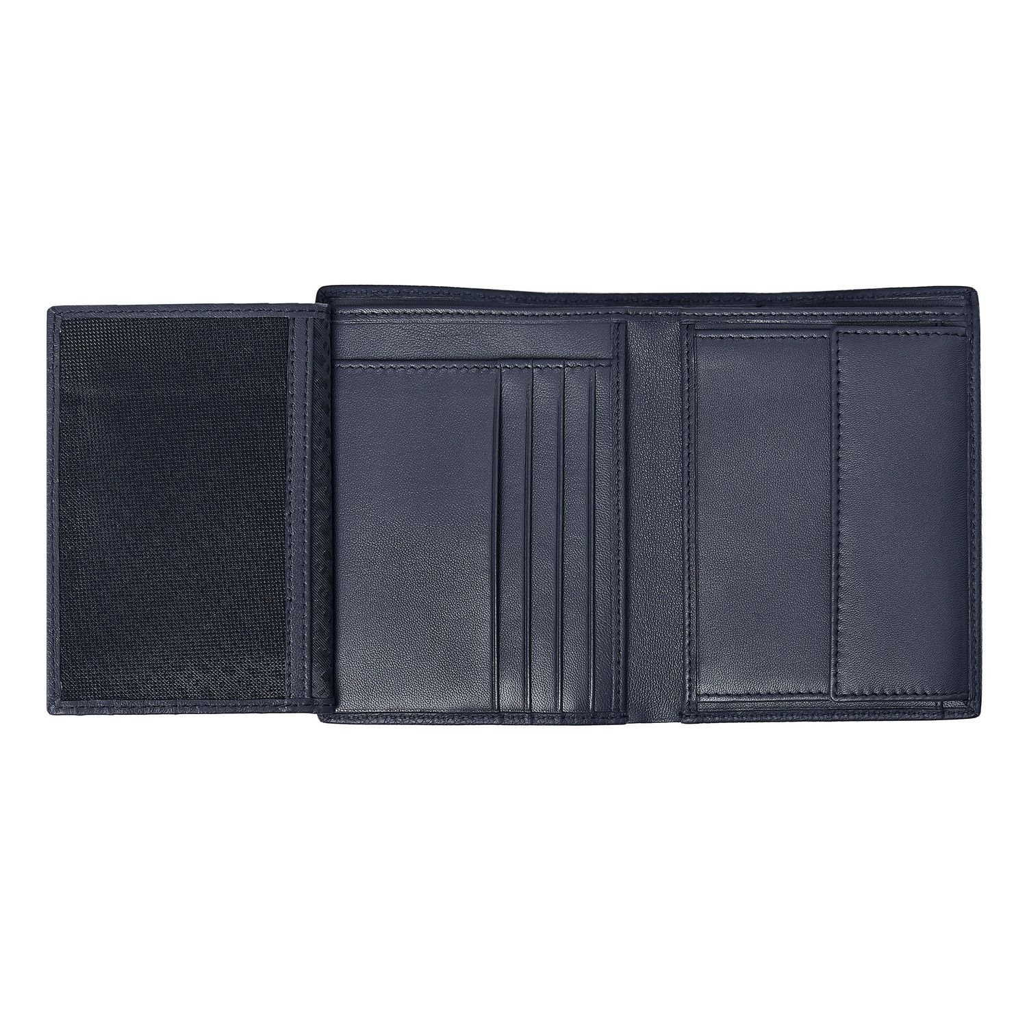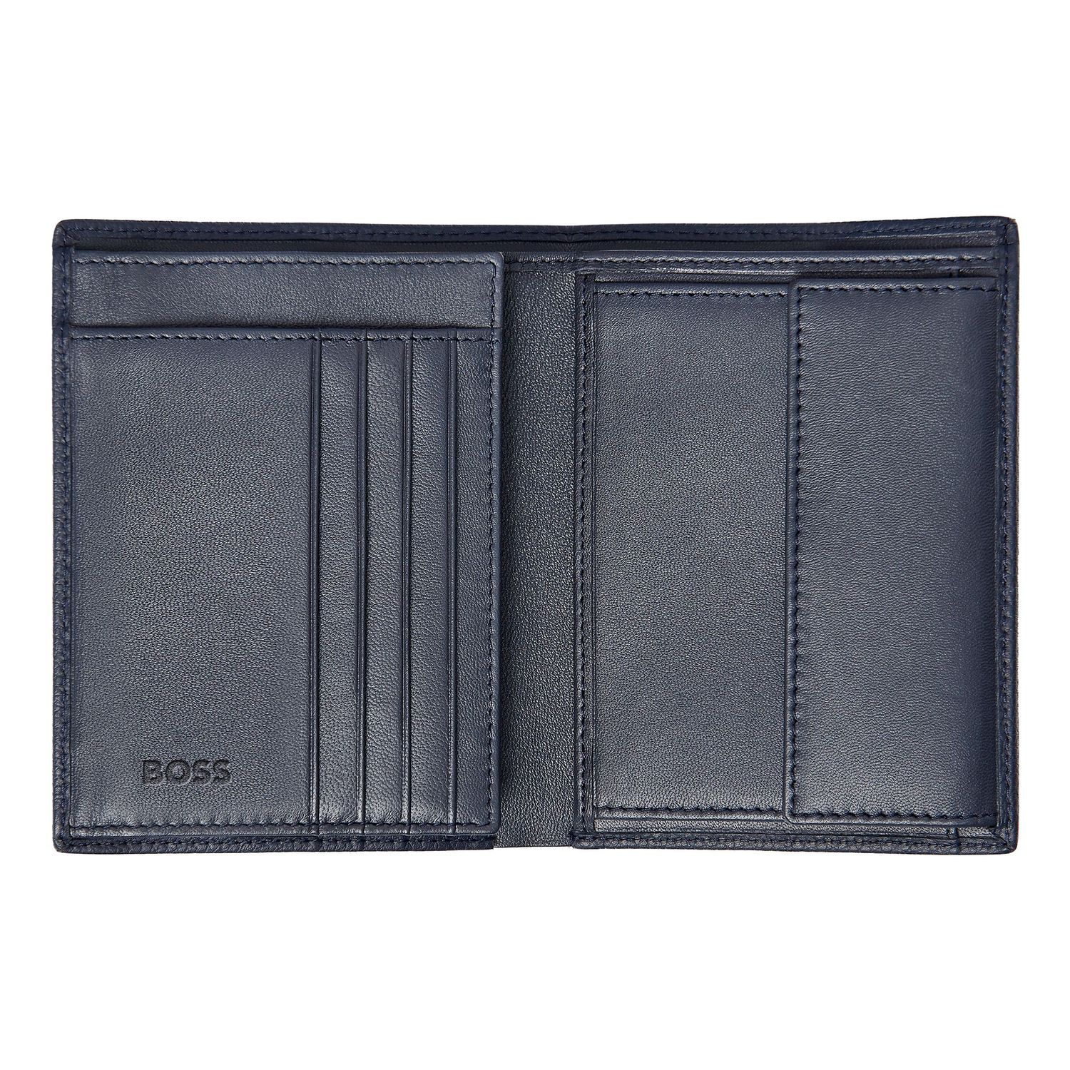 Ten pionowy portfel z klapką i kieszenią na monety jest wykonany ze starannie dobranej, najwyższej jakości granatowej skóry. Jest ozdobiony luksusową chromowaną tabliczką z podpisem BOSS i posiada wewnętrzną podszewkę z monogramem. Portfel zawiera: 2 przegrody na waluty 8 miejsc na karty 5 przegródek bocznych 1 miejsce na monety Zgodnie z DNA marki BOSS, jest prosty, funkcjonalny, elegancki i minimalistyczny.