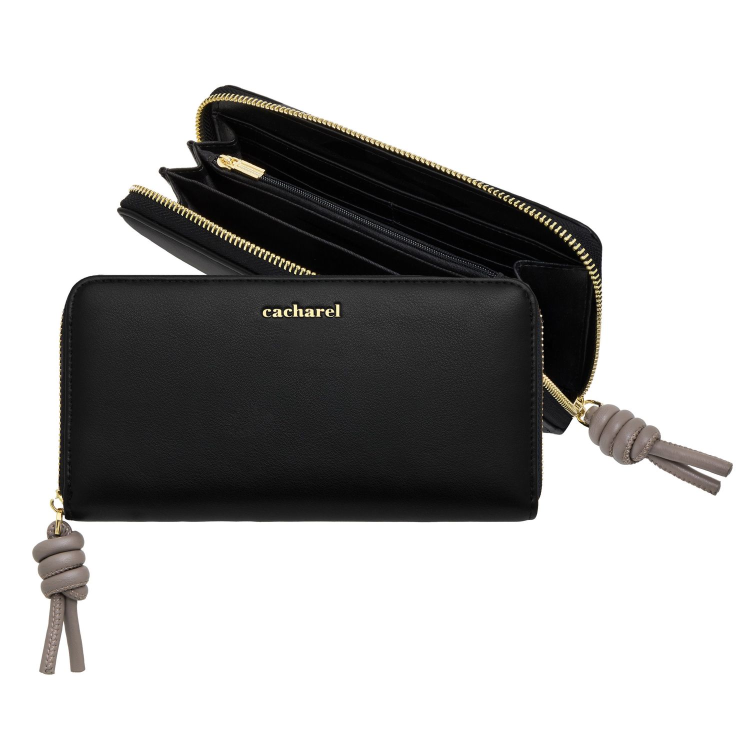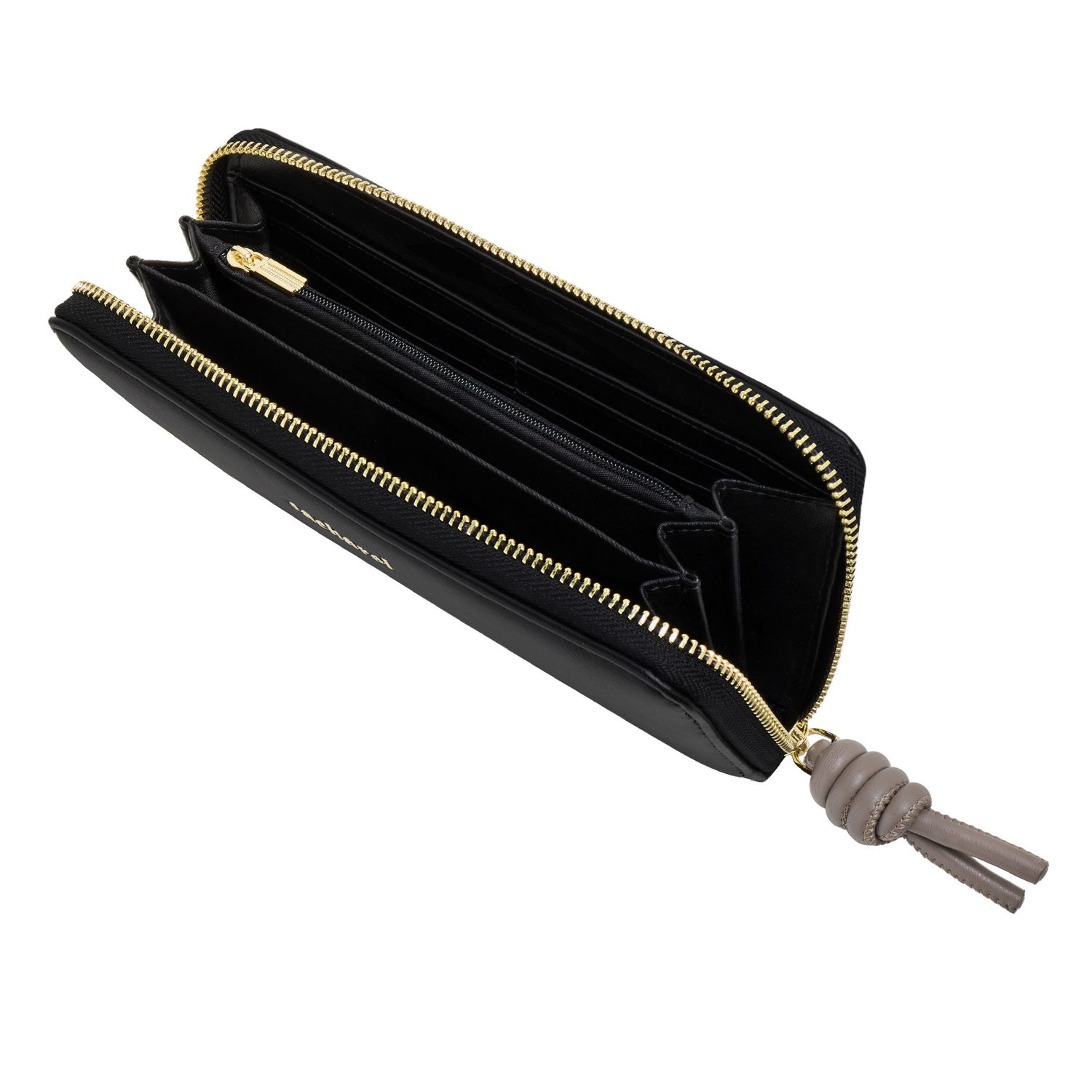Portfel Apolline w kolorze czarnym jest wykonany z miękkiej, matowej, wysokiej jakości skóry wegańskiej (PU) i posiada eleganckie złote wykończenia dla wyrafinowanego wykończenia. Sygnowany złotym logo TPU z przodu, portfel ten łączy luksus z praktycznością. Zabawny suwak w kształcie węzła w kolorze ciemnoszarym dodaje zabawnego akcentu klasycznemu wzornictwu portfela. Miękki, kolorowy i zabawny portfel Apolline doskonale uzupełnia kolekcję toreb Apolline.