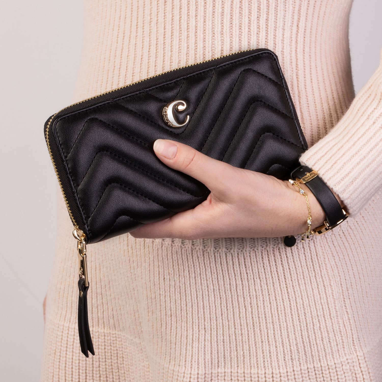 Portfel damski „Odeon” jest elegancki i subtelny, a jego pikowany wzór został wykonany na pięknej, lekko fakturowanej skórze wegańskiej (PU). Tabliczka z podpisem to nieco przerośnięta i wypukła wersja kultowego logo „C”, sygnowana grawerunkiem Cacharel. Suwak jest również sygnowany kultowym logo „C” i wykonany z pięknego pozłacanego metalu połączonego z wegańską skórą, co nadaje całości piękny, kobiecy charakter. Portfel jest klasycznego formatu, z kremowym i zorganizowanym wnętrzem zawierającym nie mniej niż 8 miejsc na karty, przegródki na banknoty i zapinaną na zamek przegródkę w środku. W przypadku linii Odeon, chcieliśmy zaoferować neutralne i ponadczasowe odcienie, wykończone złotymi akcentami dla uzyskania luksusowego wrażenia.