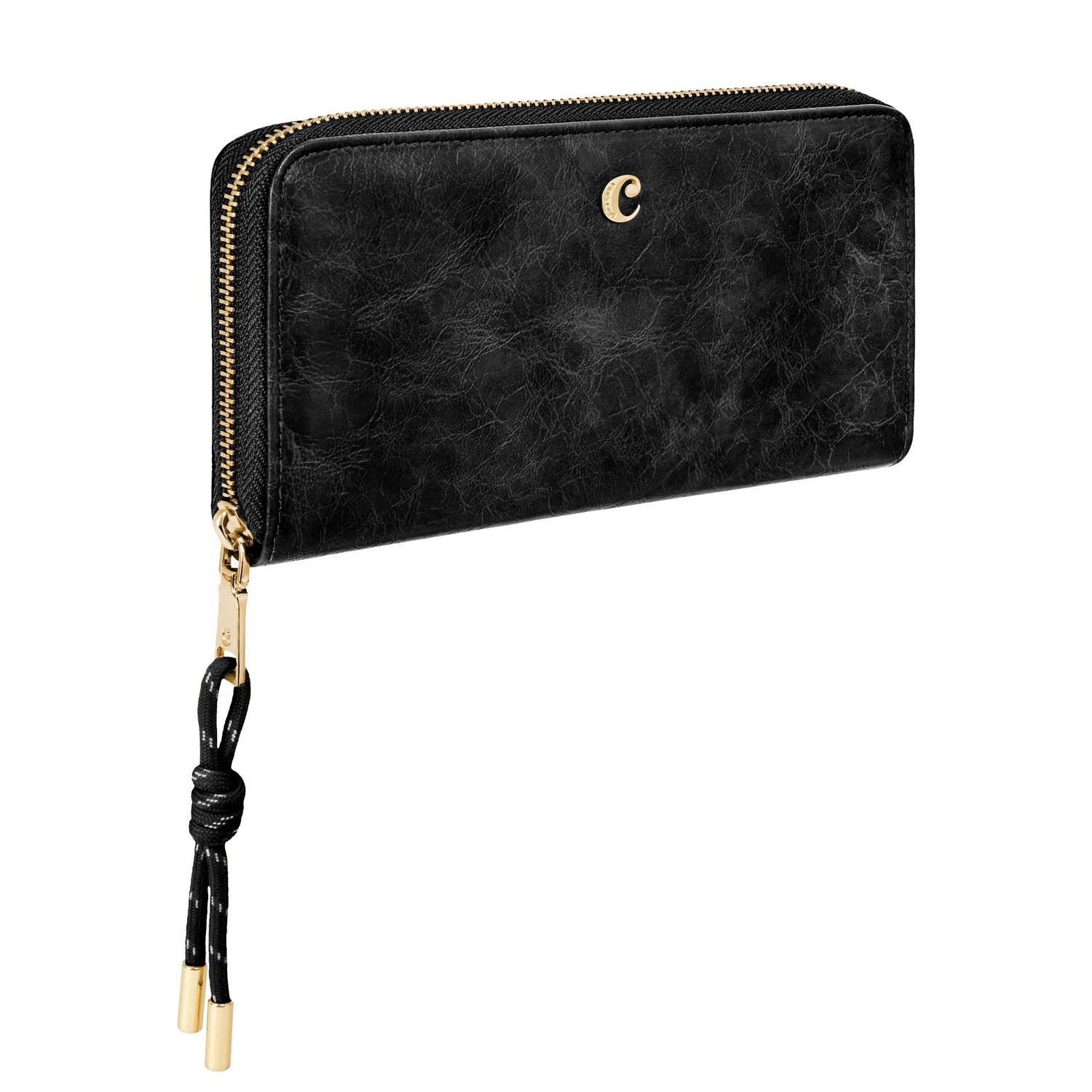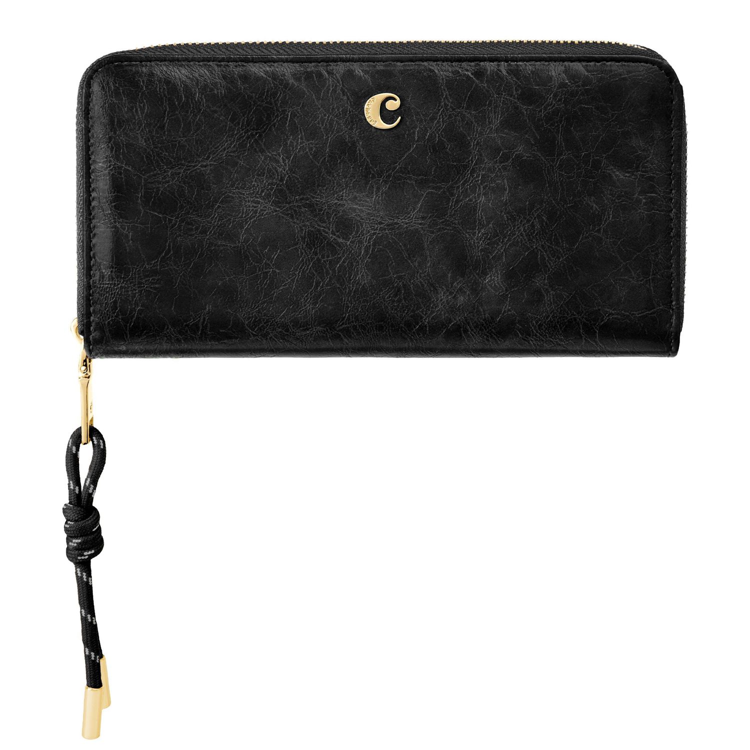 The Philomene zipped wallet combines elegance with a strong fashion-forward edge. Crafted from a glazed, crinkled leather-like texture, it is signed with the signature Cacharel C plate and highlighted by refined gold trims. Its distinctive zipper puller features a utility-inspired cord element that contrasts beautifully with the wallet’s chic and sophisticated finish. Inside its zipped interior, the wallet offers generous organization with a large zipped coin compartment, twelve card slots, and two note compartments, ensuring both style and practicality. Available in a chic palette of black, camel, and burgundy.