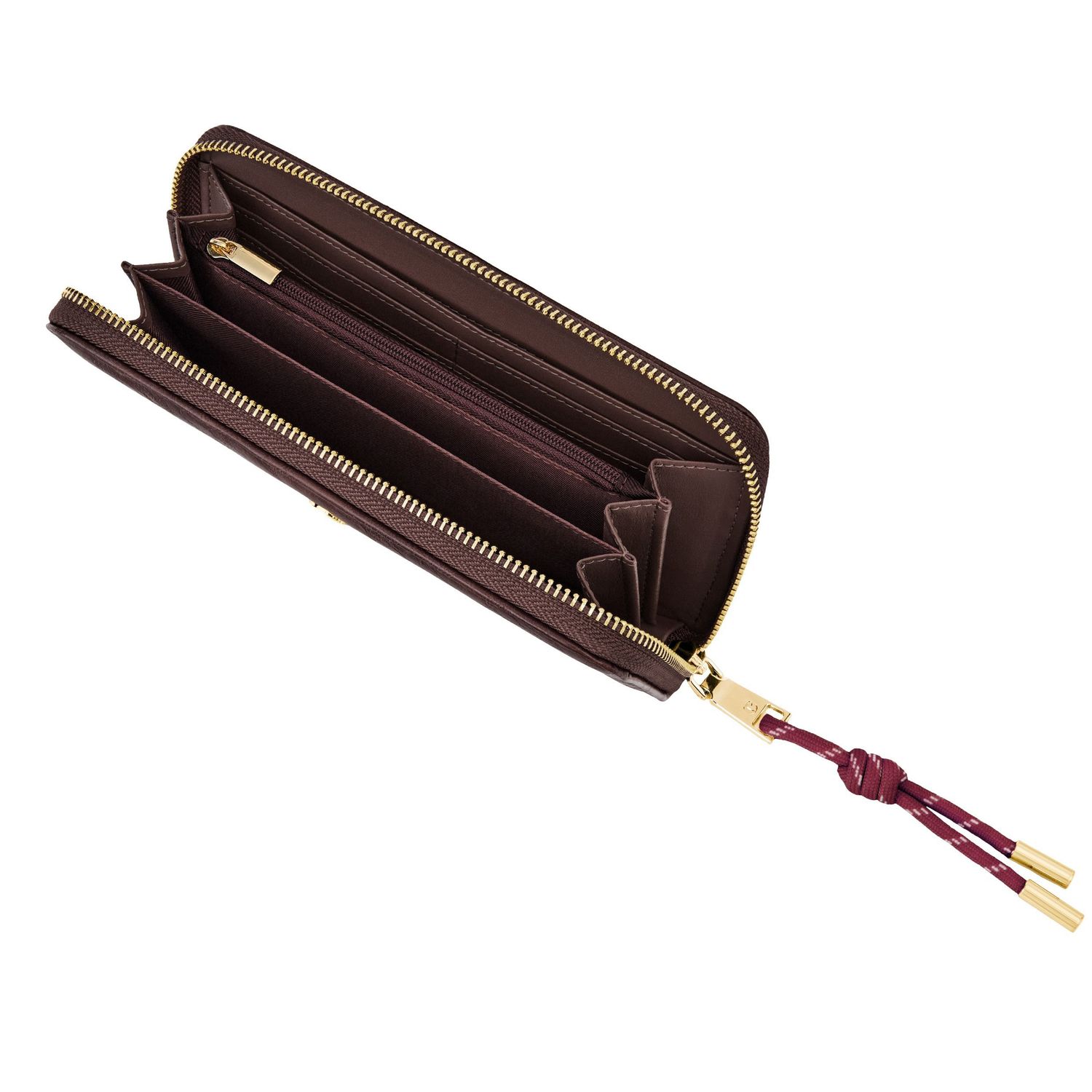 The Philomene zipped wallet combines elegance with a strong fashion-forward edge. Crafted from a glazed, crinkled leather-like texture, it is signed with the signature Cacharel C plate and highlighted by refined gold trims. Its distinctive zipper puller features a utility-inspired cord element that contrasts beautifully with the wallet’s chic and sophisticated finish. Inside its zipped interior, the wallet offers generous organization with a large zipped coin compartment, twelve card slots, and two note compartments, ensuring both style and practicality. Available in a chic palette of black, camel, and burgundy.