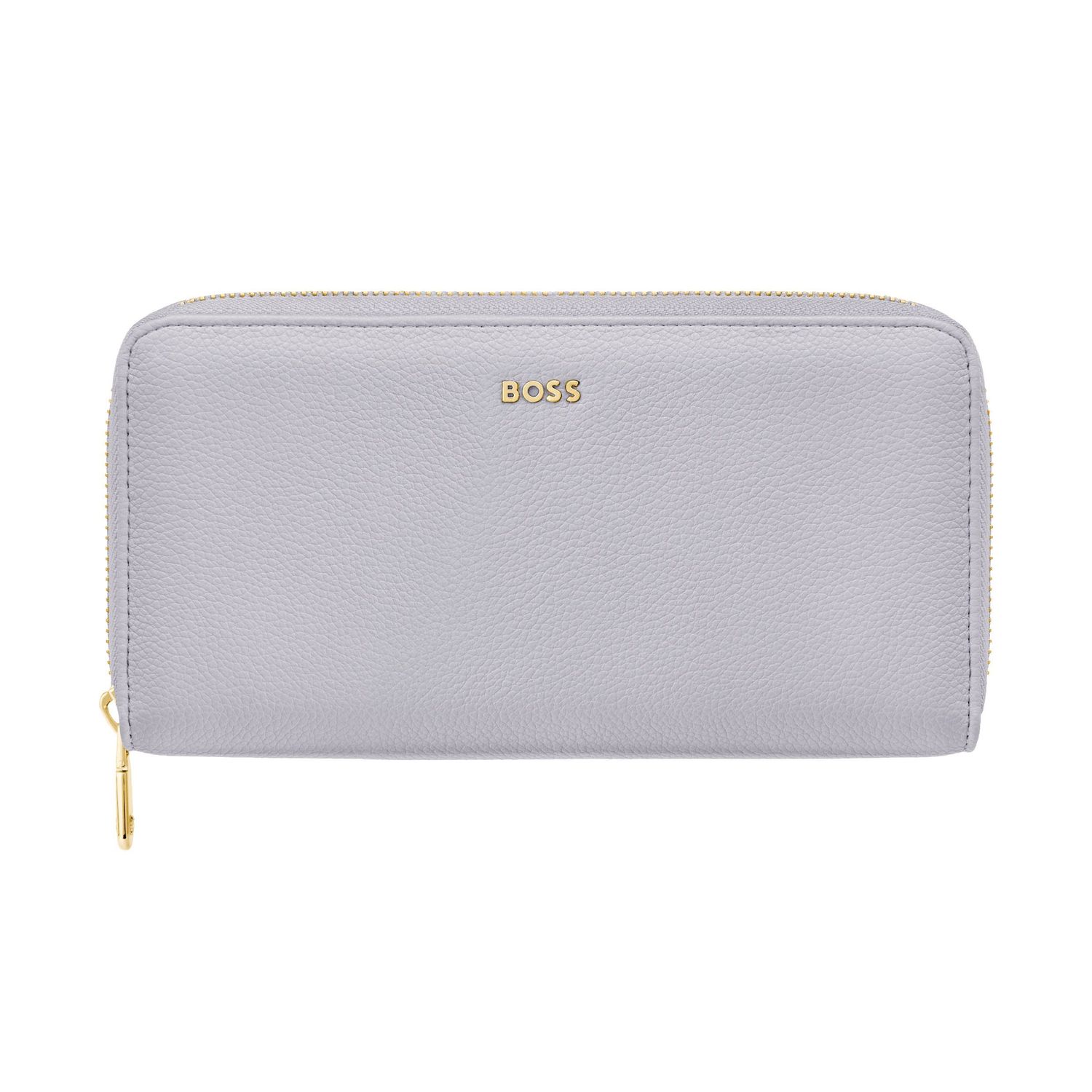 This classic zipped wallet is crafted from carefully selected grained matte PU with a soft, refined hand feel. The design is highlighted by a BOSS logo signature plate on the front and complemented by newly developed light gold–plated zippers featuring a Double B detail. Designed for everyday organization, it offers twelve card slots with six on each side, two note compartments positioned on either side, and a central zipped compartment for secure storage. Finished entirely with light gold trims for an elevated and luxurious touch, the wallet is available in a soft color palette including black, burgundy, taupe, nude, and lilac.