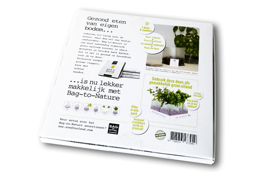 Dzięki zróżnicowanej linii produktów Bag-to-Nature warzywa rosną w kompaktowej torebce na blacie lub balkonie. Po prostu daj im trochę wody i trochę miłości. Oferujemy inspirujący asortyment smaków, w tym Rukola, Rzodkiewka, Szpinak lub Bazylia.