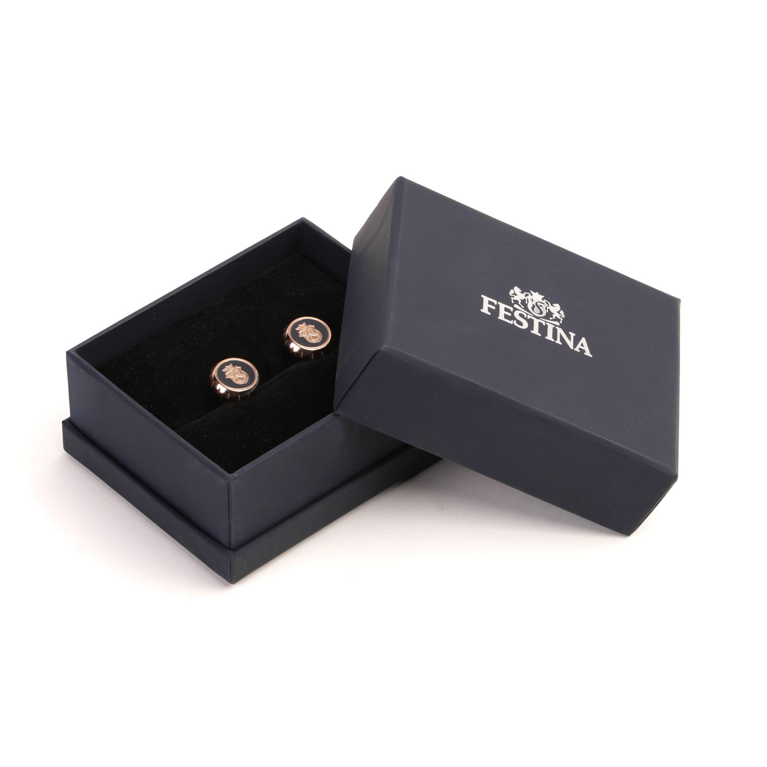 Nasze spinki do mankietów „Chronobike” są bezpośrednio inspirowane ikonicznym przyciskiem stopu zegarka Festina i ozdobione sygnaturą. Są one wykonane z nierdzewnej stali szlachetnej. Ta błyszcząca wersja w kolorze różowego złota, wykończona ciemną marynarską emalią jest ponadczasowym klasykiem.