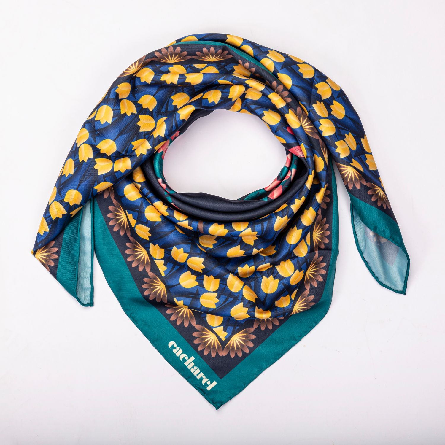 Szale Albane, dzięki swojej żywej palecie kolorów i luksusowej fakturze twill, są inspirowane wyimaginowanym ogrodem botanicznym. Ta wersja łączy głęboką zieleń z żółtymi i niebieskimi odcieniami. Marynarskie akcenty dodają elegancji. Doskonale nadaje się do wykończenia każdego stroju.