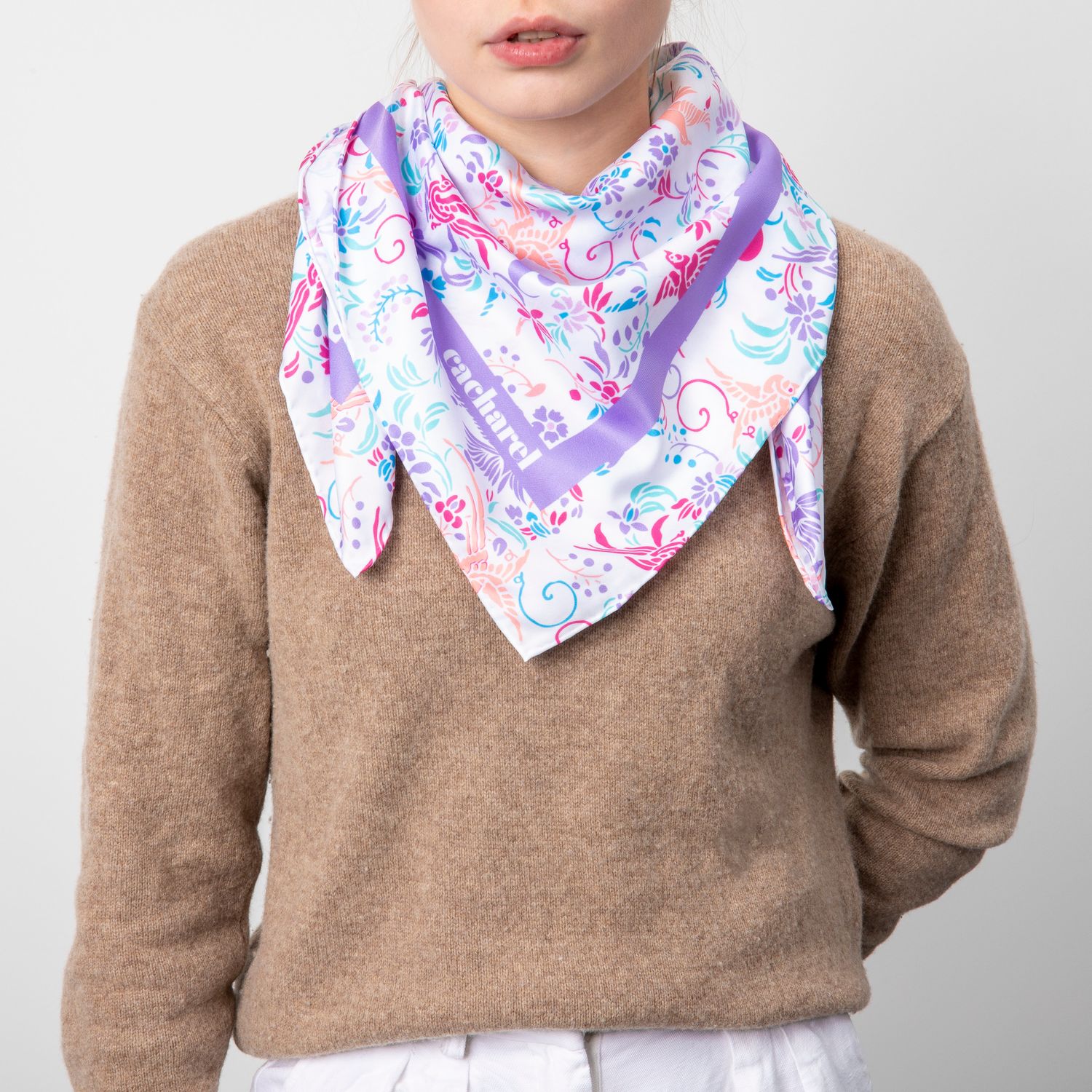 Na szalu „Alma” nadrukowane są świeże i romantyczne kwiaty i ptaki inspirowane wolnością, w jasnych i poetyckich odcieniach. Szal wykonany jest z wegańskiego jedwabiu (Polyester twill). Jego rozmiar, 90 X 90 cm sprawia, że jest to bardzo uniwersalny dodatek, który można nosić na setki różnych sposobów.