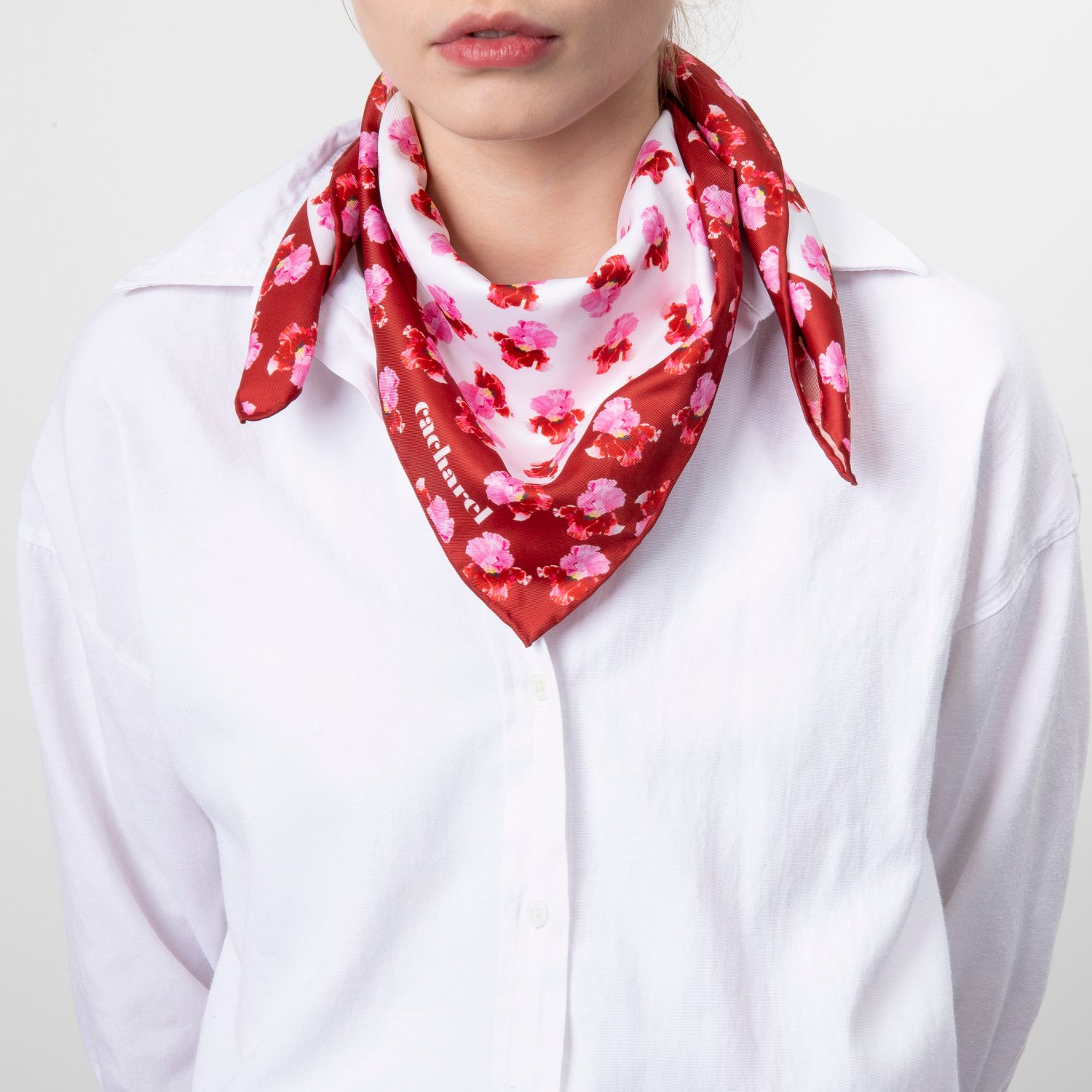 Szalik „Hortense” ma świeży i kobiecy wzór kwiatowy inspirowany wiosennym ogrodem. Jest wykonana z wegańskiego (syntetycznego) jedwabiu o wymiarach 65 x 65 cm. Ten szalik jest dostępny w kolorze niebieskim lub czerwonym i może być owinięty wokół rączek Twojej torby Hortense dla uzyskania współczesnego wyglądu.