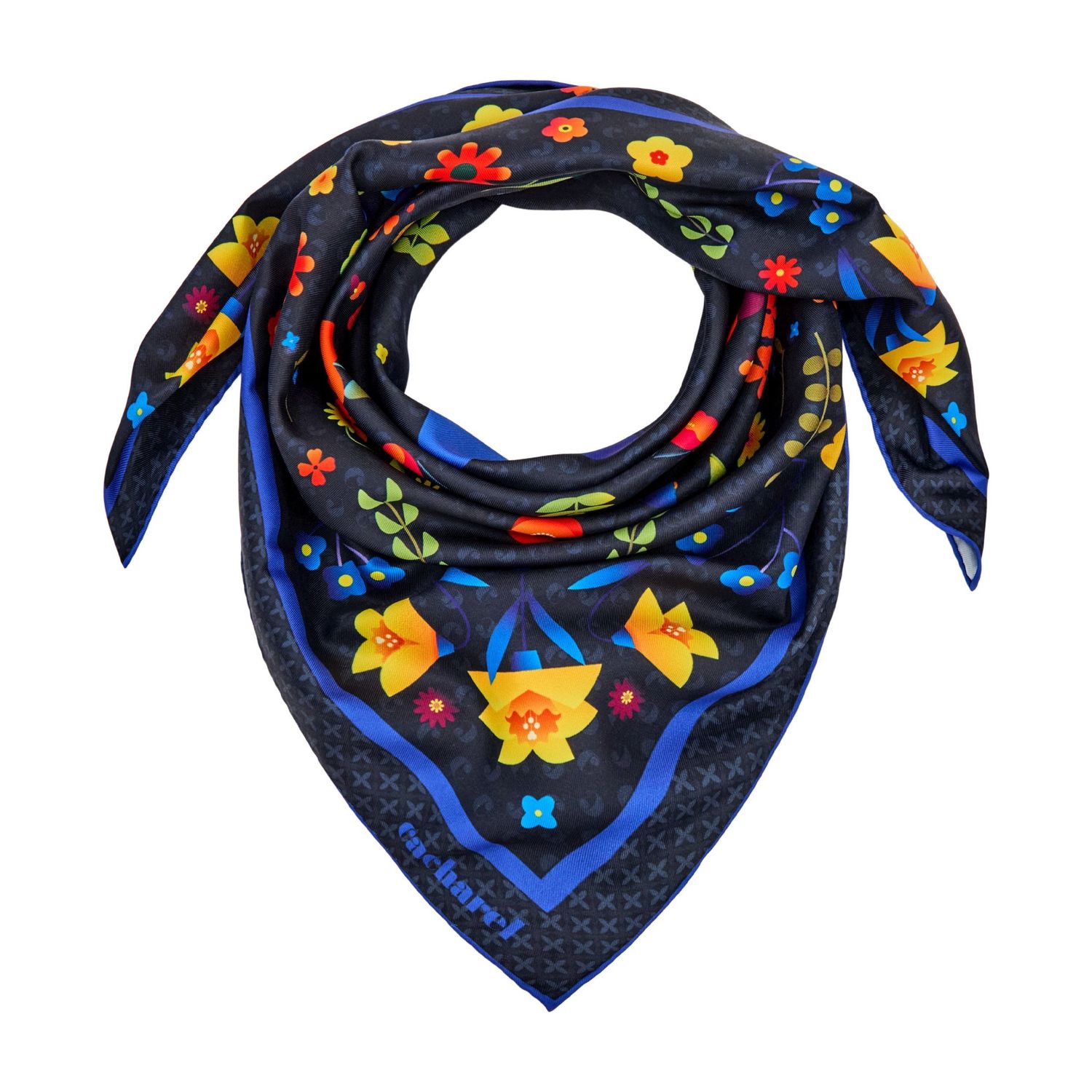 The Philomene scarf offers a contemporary, graphical take on the classical square-scarf composition, blending colorful floral elements with a clean, modern layout that feels both expressive and easy to pair. Available in navy or white, it brings a refined burst of color and pattern to the silhouette, creating a lively yet elegant accent for everyday styling.