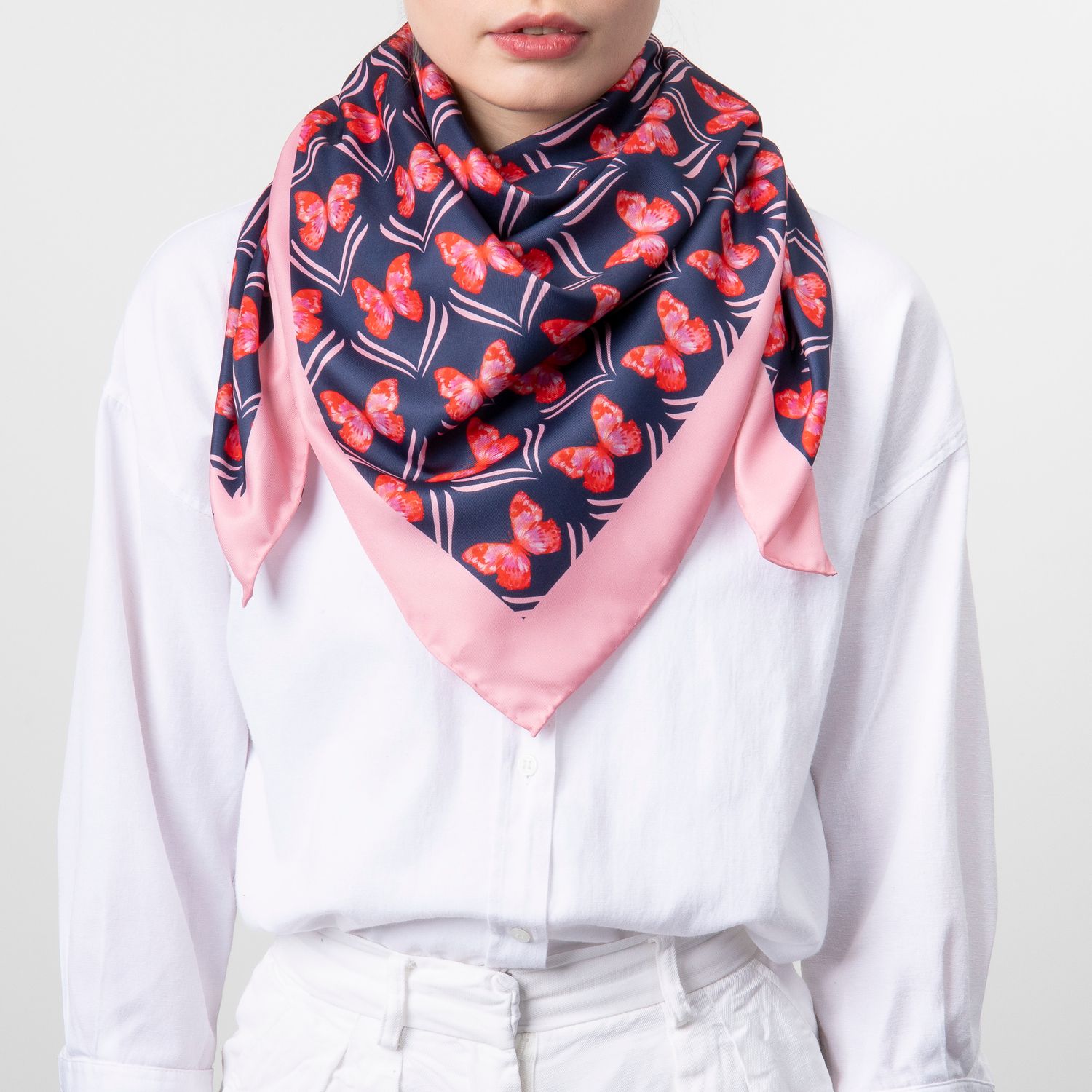Szalik Pontia jest zadrukowany świeżymi i romantycznymi motylami, podkreślonymi kontrastowymi kolorami. Ten szalik wykonany jest z wegańskiego jedwabiu (syntetycznego), a jego rozmiar 90X90 cm sprawia, że jest on modnym must-have w tym sezonie. Dostępny jest w kolorze granatowym, liliowym i kości słoniowej.