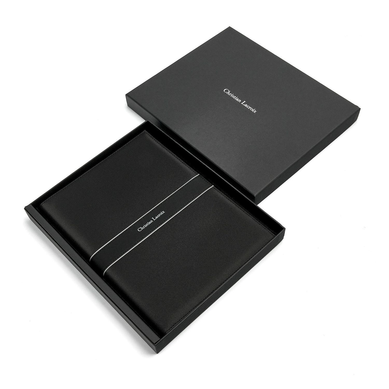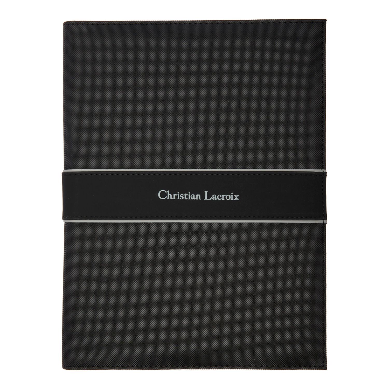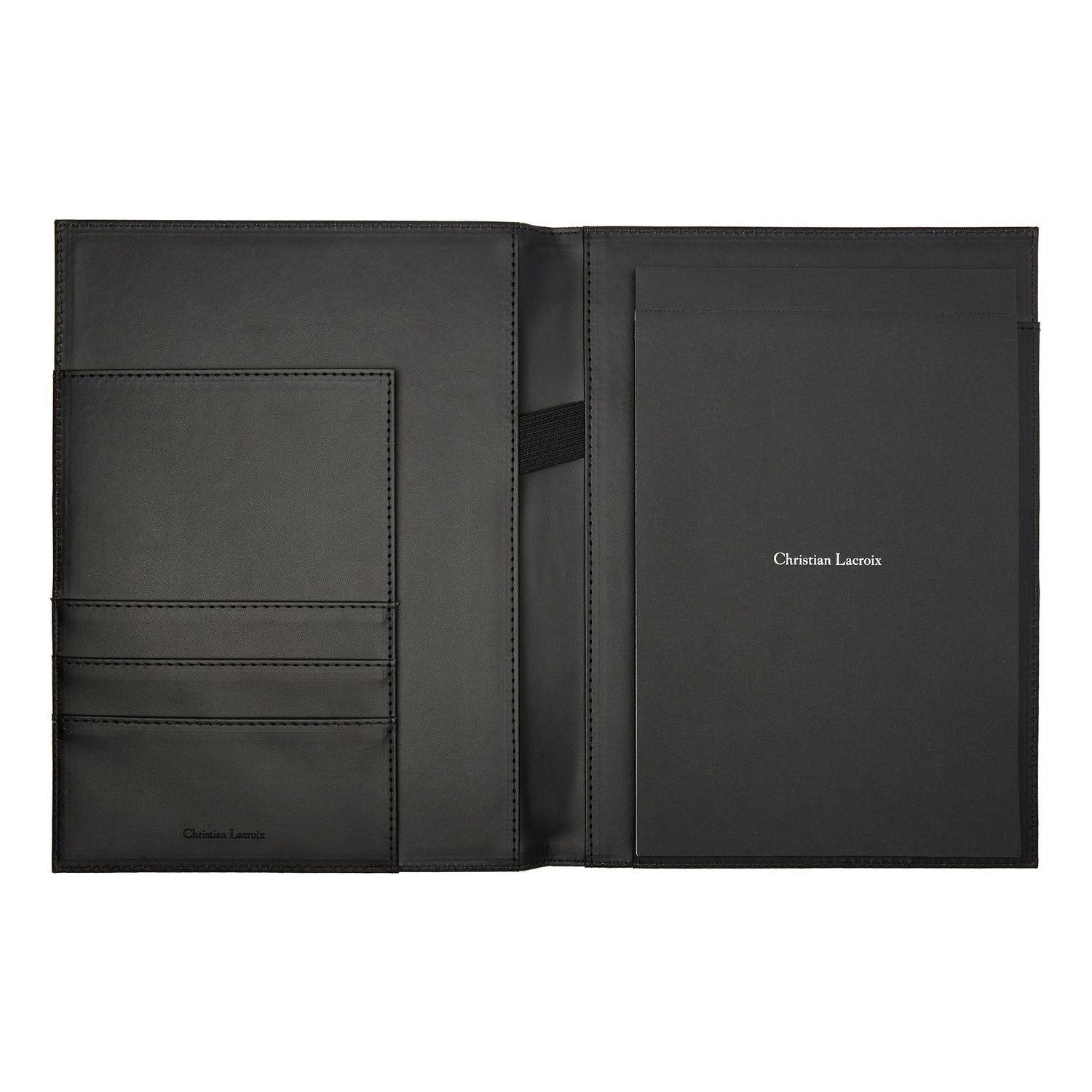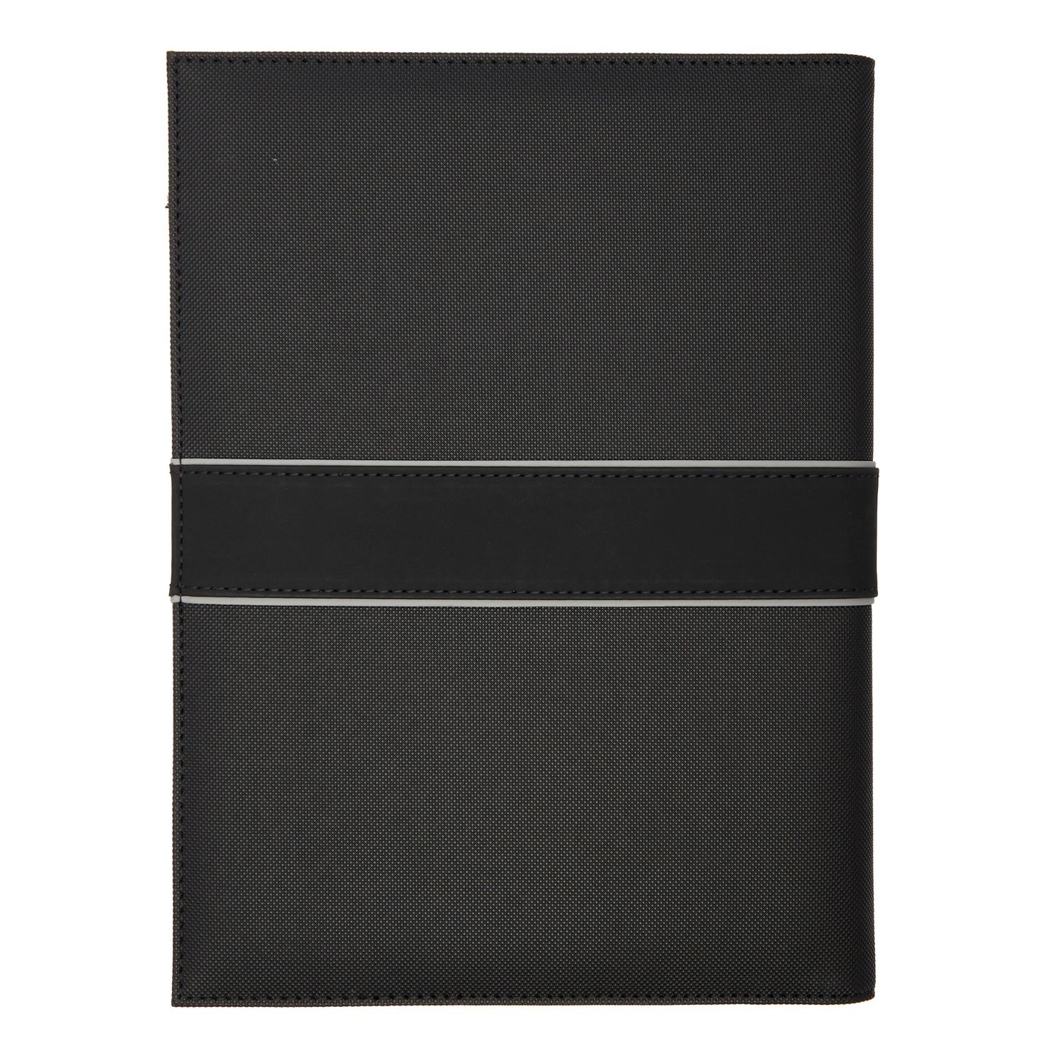 Folder do pisania „Caprio”: Idealny do tworzenia eleganckich zestawów z długopisami, charakteryzujący się nowoczesną estetyką. Czarna tekstura przypominająca diament, matowy pasek z logo z dwoma szarymi paskami dla podkreślenia oraz matowe wykonanie logo z TPU. Wykonany z PU. Dostępne w dwóch rozmiarach: A5 i A4.