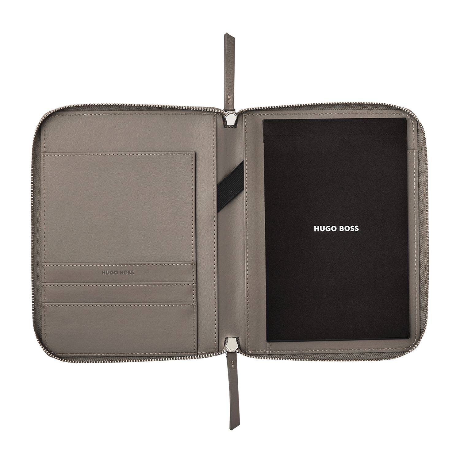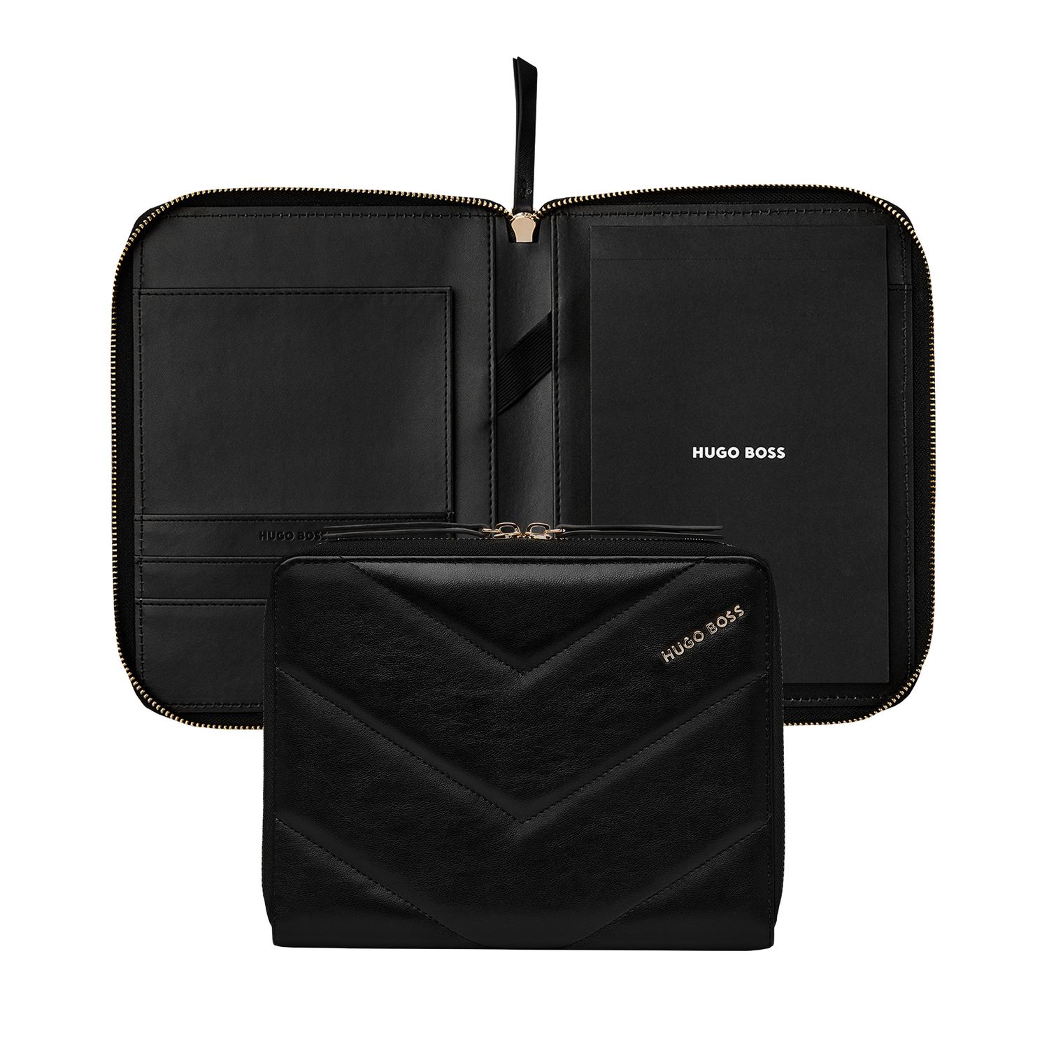 Kobiece i eleganckie teczki Triga są wzbogacone o luksusowe złote akcenty i matową fakturę skóry wegańskiej. Podpisane są piękną złotą płytką z logo HUGO BOSS, a ich powierzchnia jest pikowana geometrycznym i graficznym wzorem, co czyni je zarówno nowoczesnymi jak i kobiecymi. Teczka A5 dostępna jest w 3 luksusowych i ciepłych odcieniach: czarnym, beżowym lub taupe. Będzie idealnym towarzyszem na co dzień, pozwalając na robienie notatek na papierowej podkładce, ale także posiadając kremowe wnętrze, które pozwoli uporządkować wszystkie dokumenty. Linia „Triga” jest idealna do łączenia i dopasowywania w kombinacje, które odpowiadają Twojemu gustowi, aby stworzyć skromne, ale wyrafinowane zestawy prezentowe.