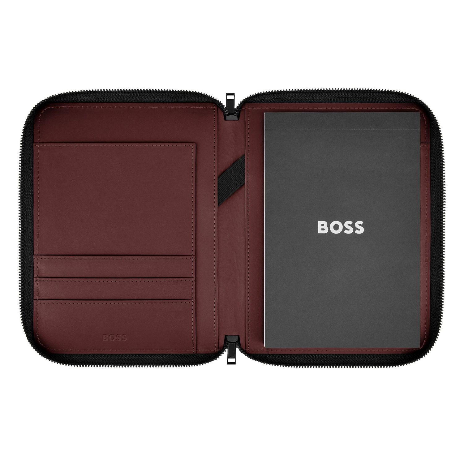 The Varsity folder brings a colorful, graphical twist to a varsity-inspired aesthetic, expressed through an impactful palette of black, camel, burgundy, dark green, and navy. Each version features an oversized, contrastive Double B logo patch highlighted by fresh white outlines, delivering a bold, collegiate touch. Black trims add modernity to the design, while the new BOSS zipper pullers provide a refined and contemporary finish.