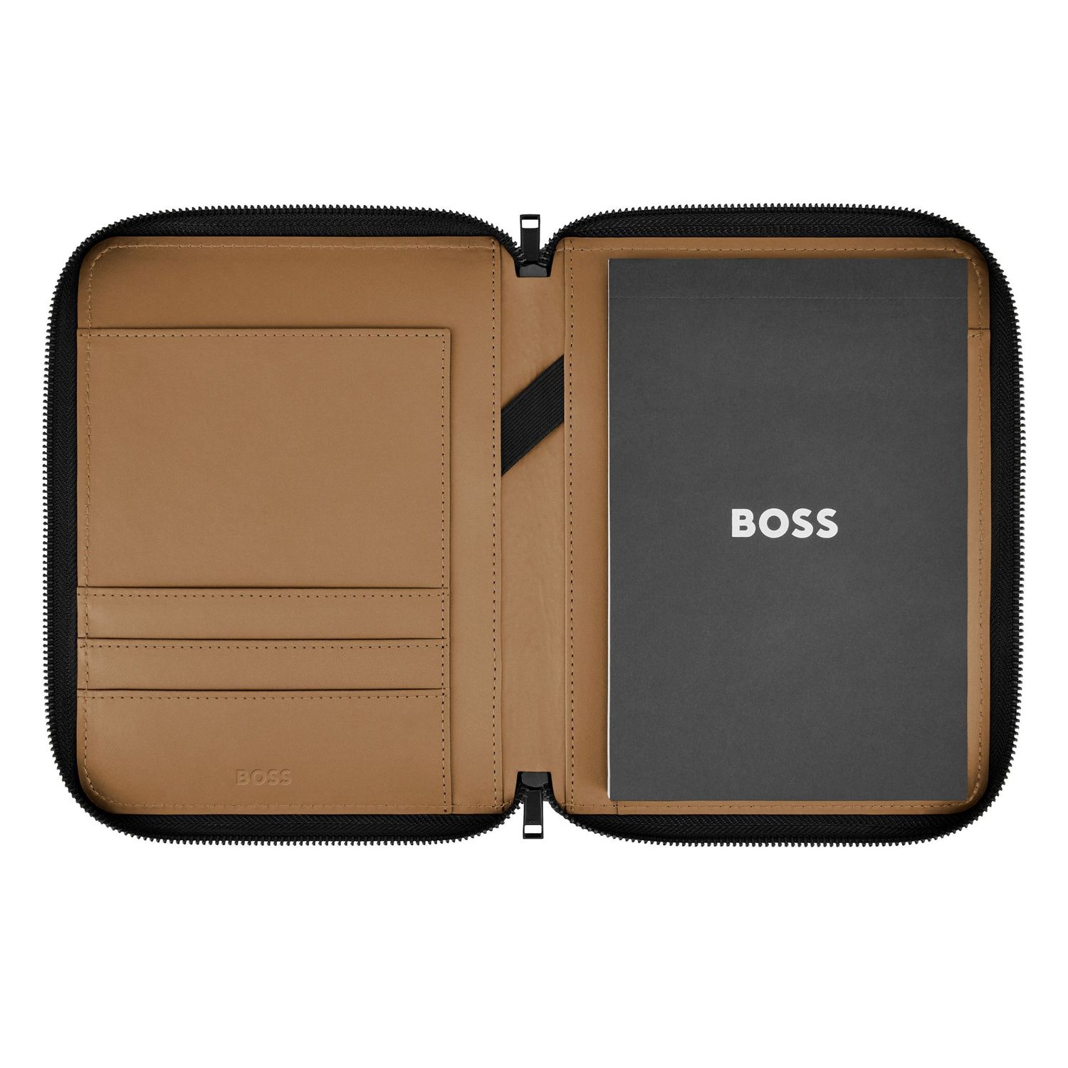 The Varsity folder brings a colorful, graphical twist to a varsity-inspired aesthetic, expressed through an impactful palette of black, camel, burgundy, dark green, and navy. Each version features an oversized, contrastive Double B logo patch highlighted by fresh white outlines, delivering a bold, collegiate touch. Black trims add modernity to the design, while the new BOSS zipper pullers provide a refined and contemporary finish.