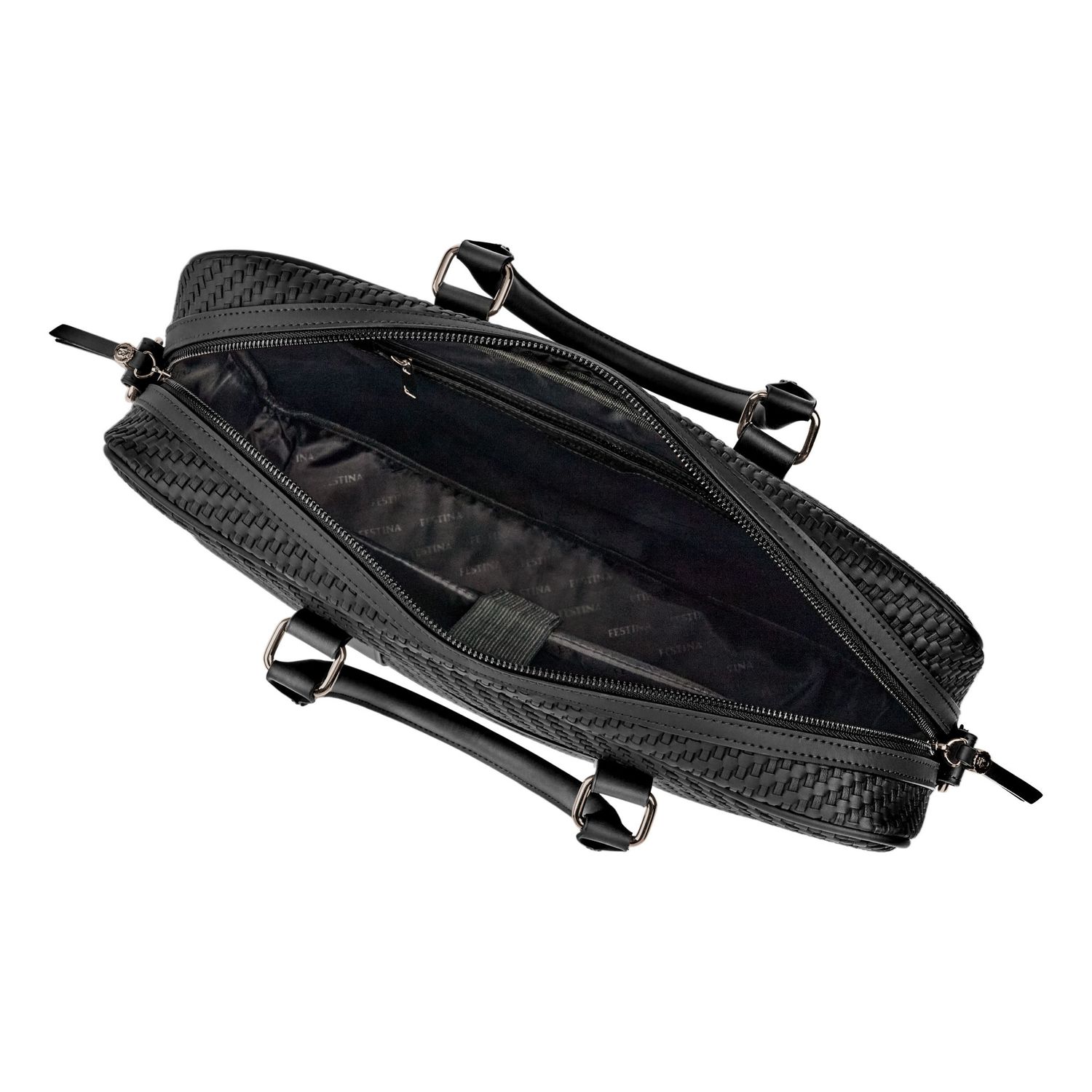 The Interlace document bag in black brings the line’s woven-inspired texture into a classical, timeless silhouette. Crafted to resemble meticulous braiding and finished in a smooth matte, it offers a luxurious, contemporary feel enriched by signed details, including blazon-engraved zipper pullers. Inside, the organisation is ideal, featuring a dedicated laptop compartment, an inside zipped pocket, and a monogramed lining that reinforces the refined finishing. A retractable, adjustable strap signed with the logo adds comfort and practicality for daily use. Completed with sleek gun accents, the design remains resolutely chic, centered on rich texture and modern elegance.