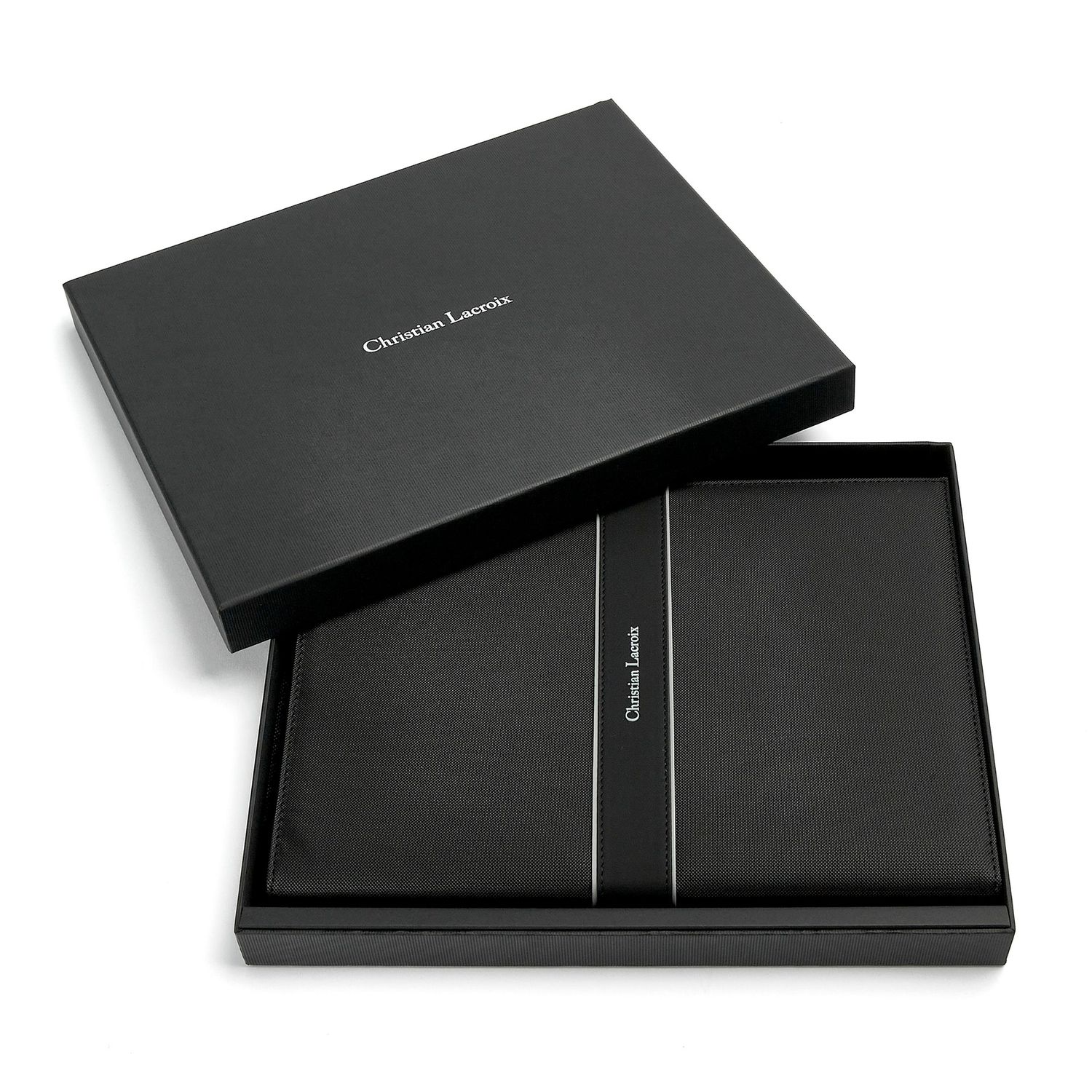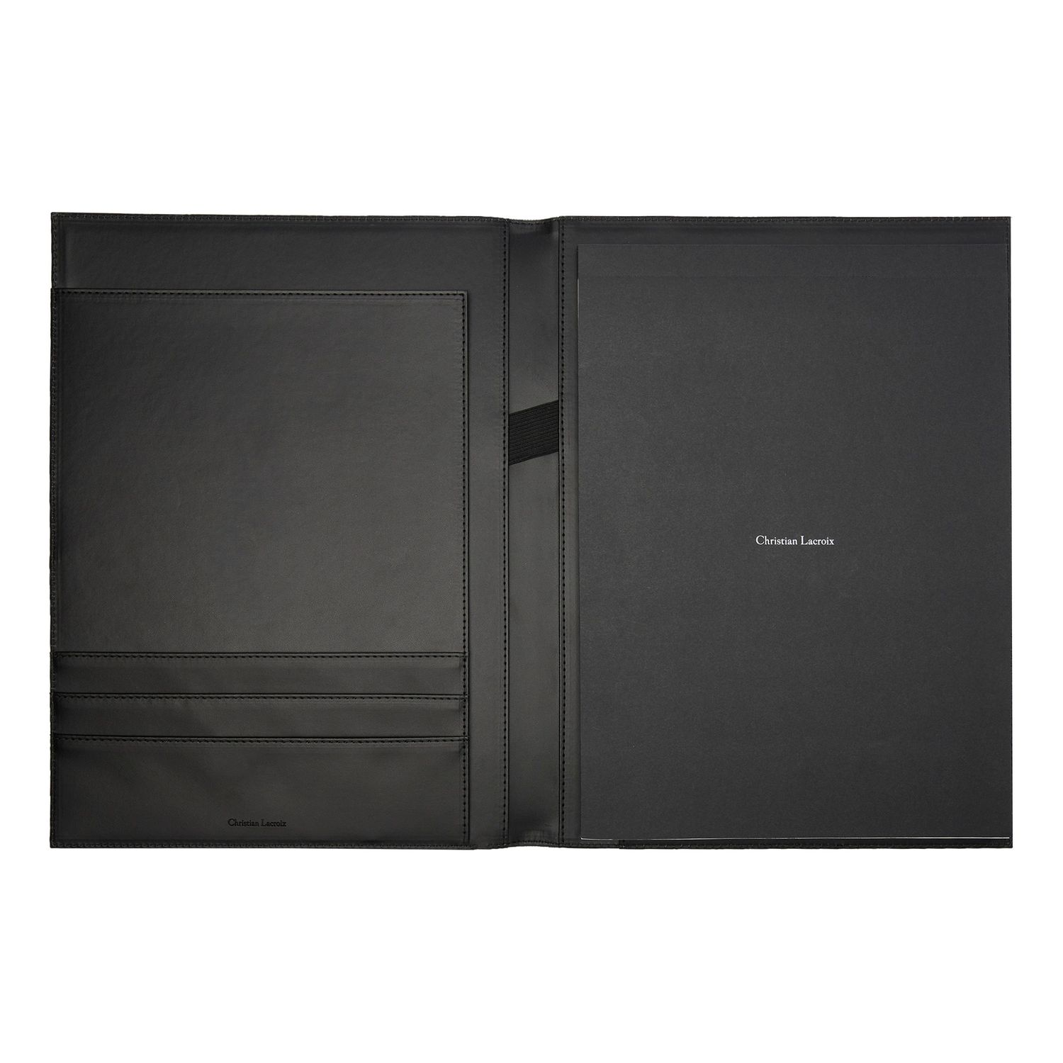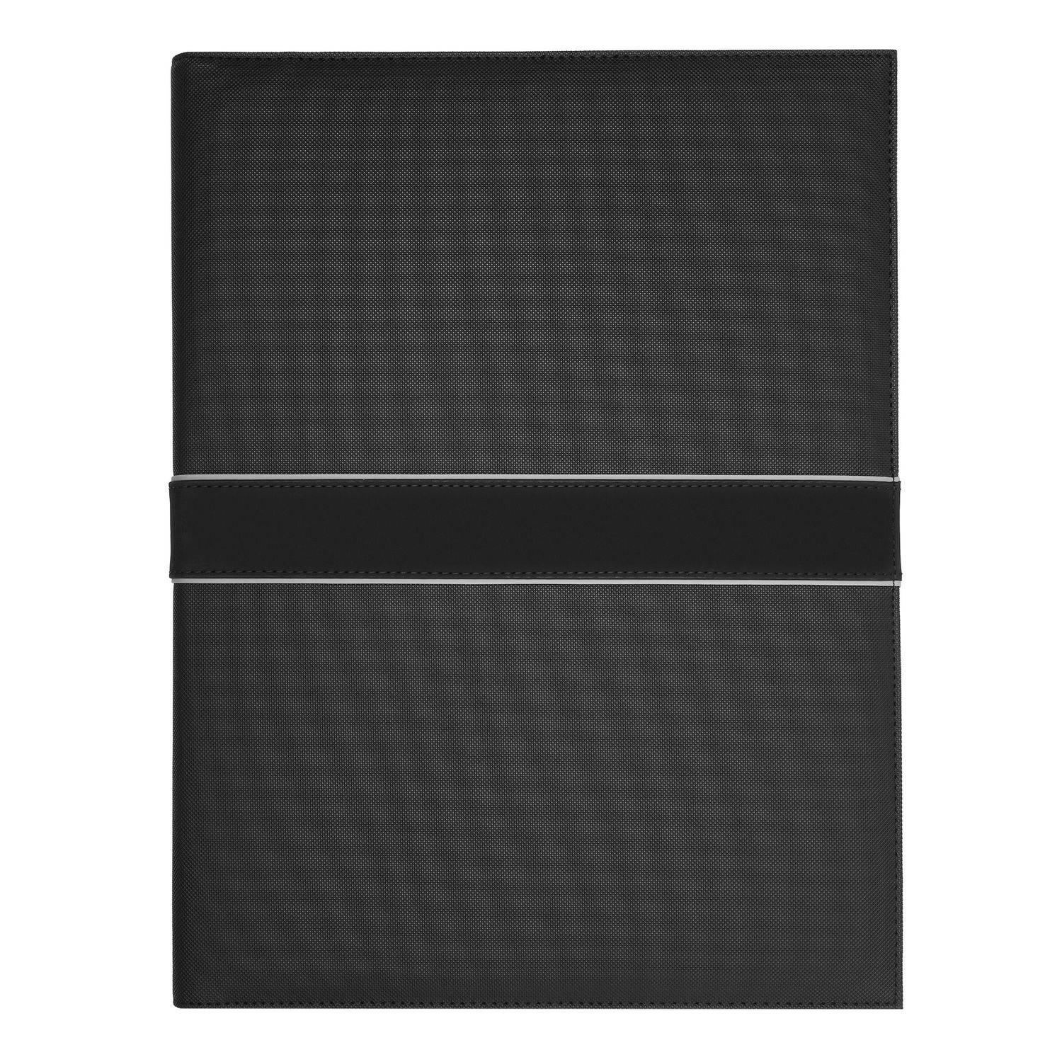 Folder do pisania „Caprio”: Idealny do tworzenia eleganckich zestawów z długopisami, charakteryzujący się nowoczesną estetyką. Czarna tekstura przypominająca diament, matowy pasek z logo z dwoma szarymi paskami dla podkreślenia oraz matowe wykonanie logo z TPU. Wykonany z PU. Dostępne w dwóch rozmiarach: A5 i A4.