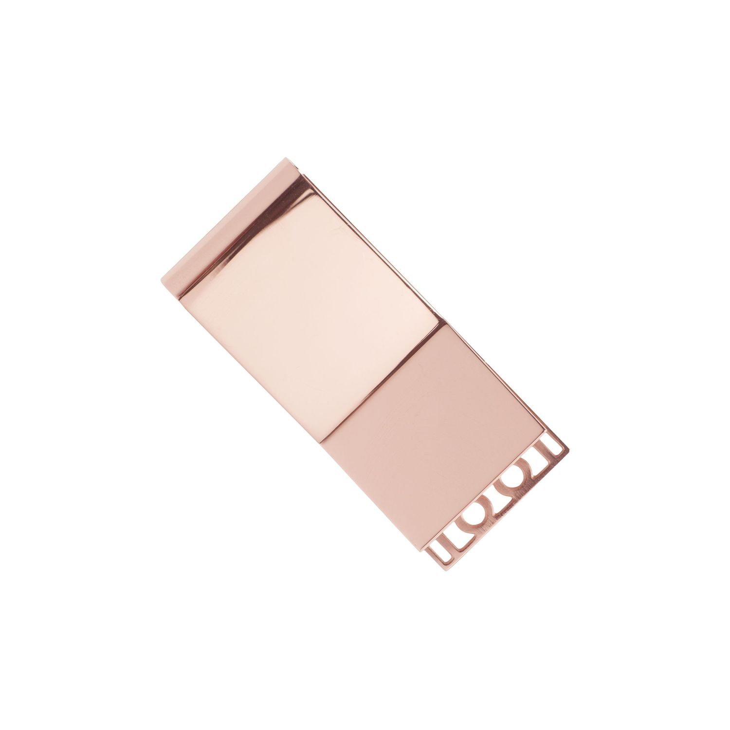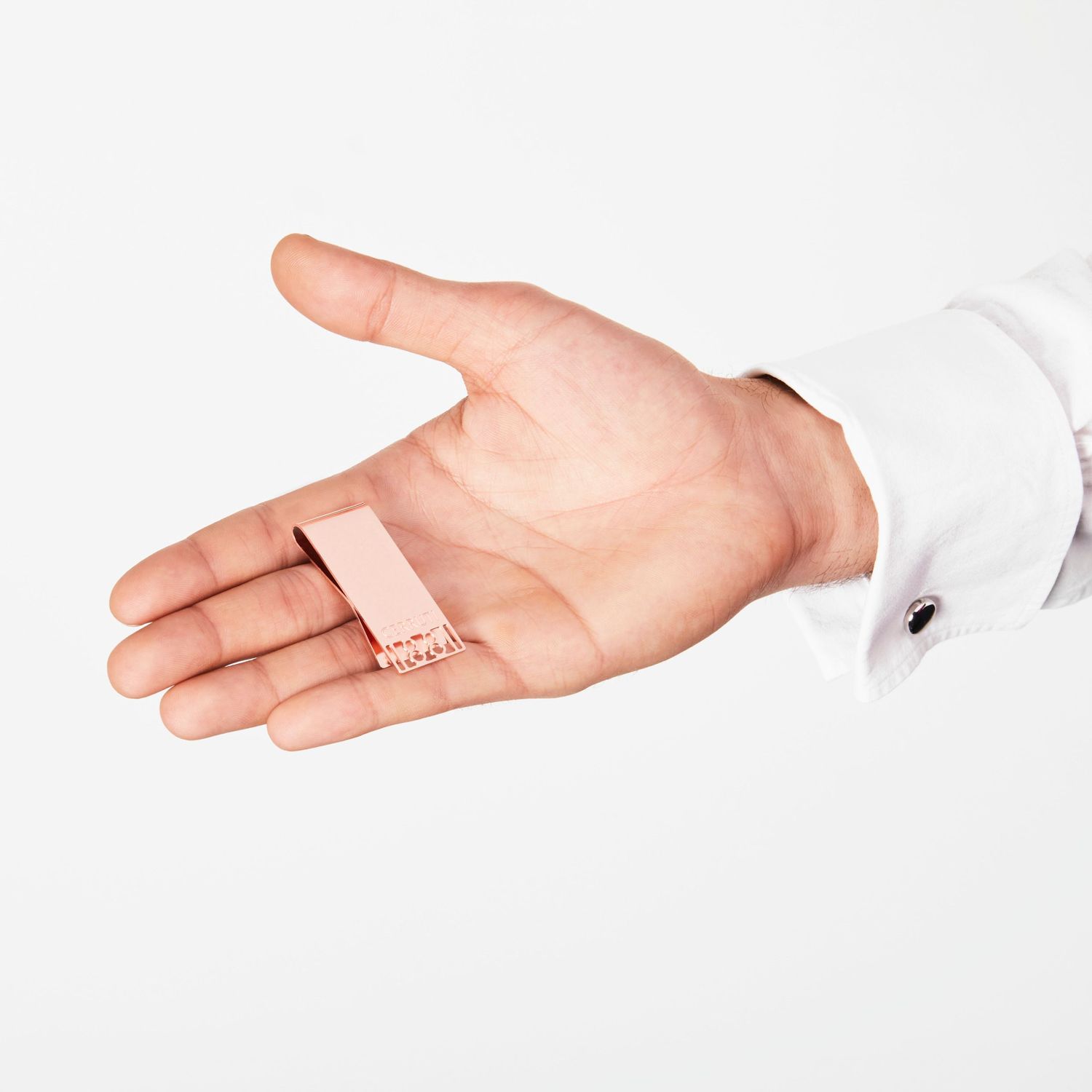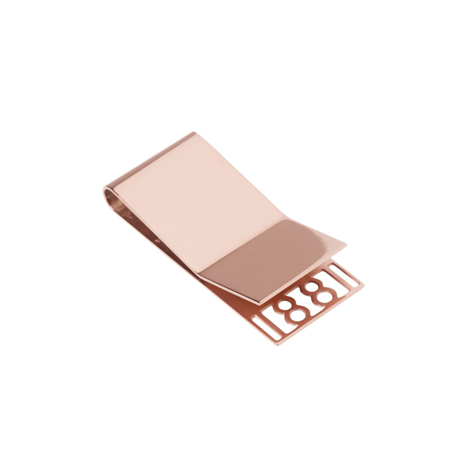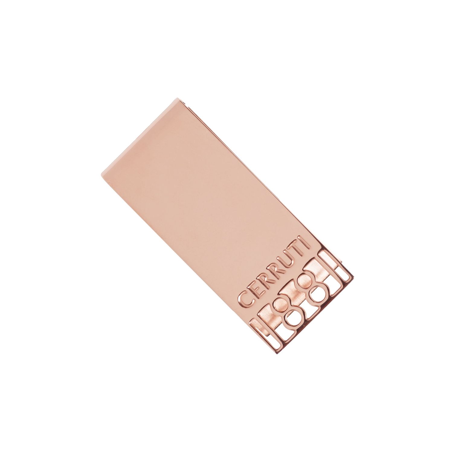Błyszczący, różowo-złoty Zoom Zoom moneyclip z delikatnie wytłoczonym logo Cerruti na polerowanej powierzchni, podczas gdy 1881 jest cięty laserowo.