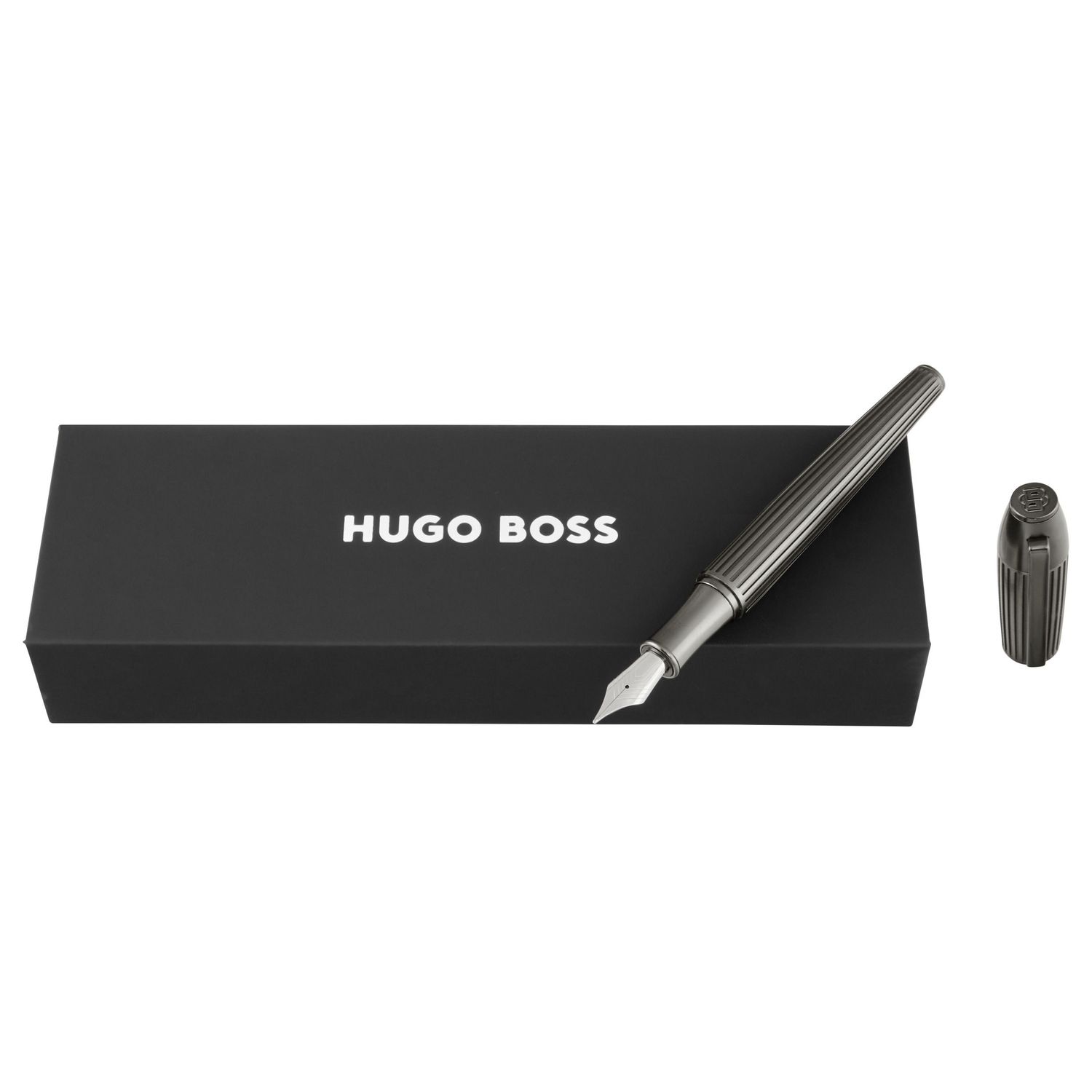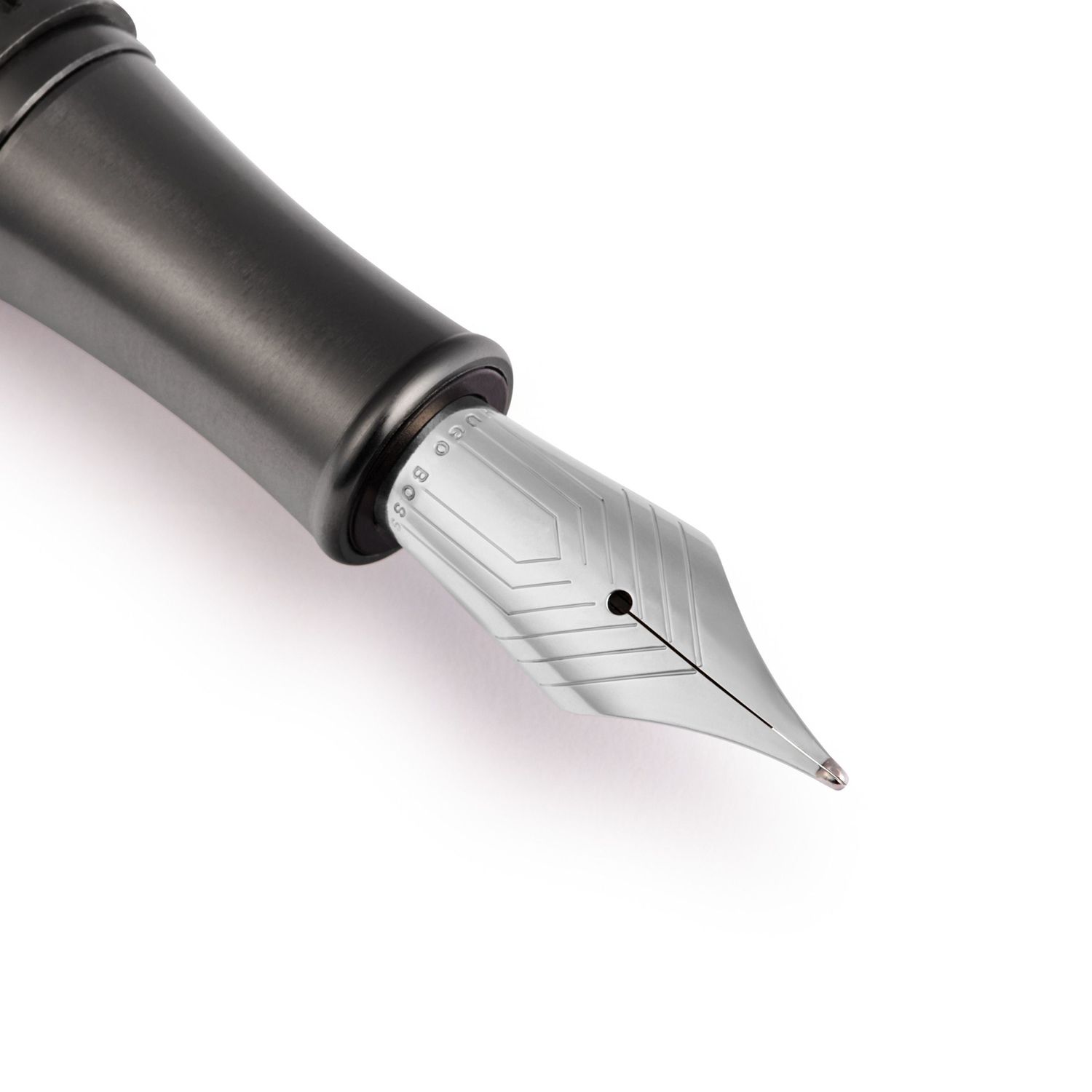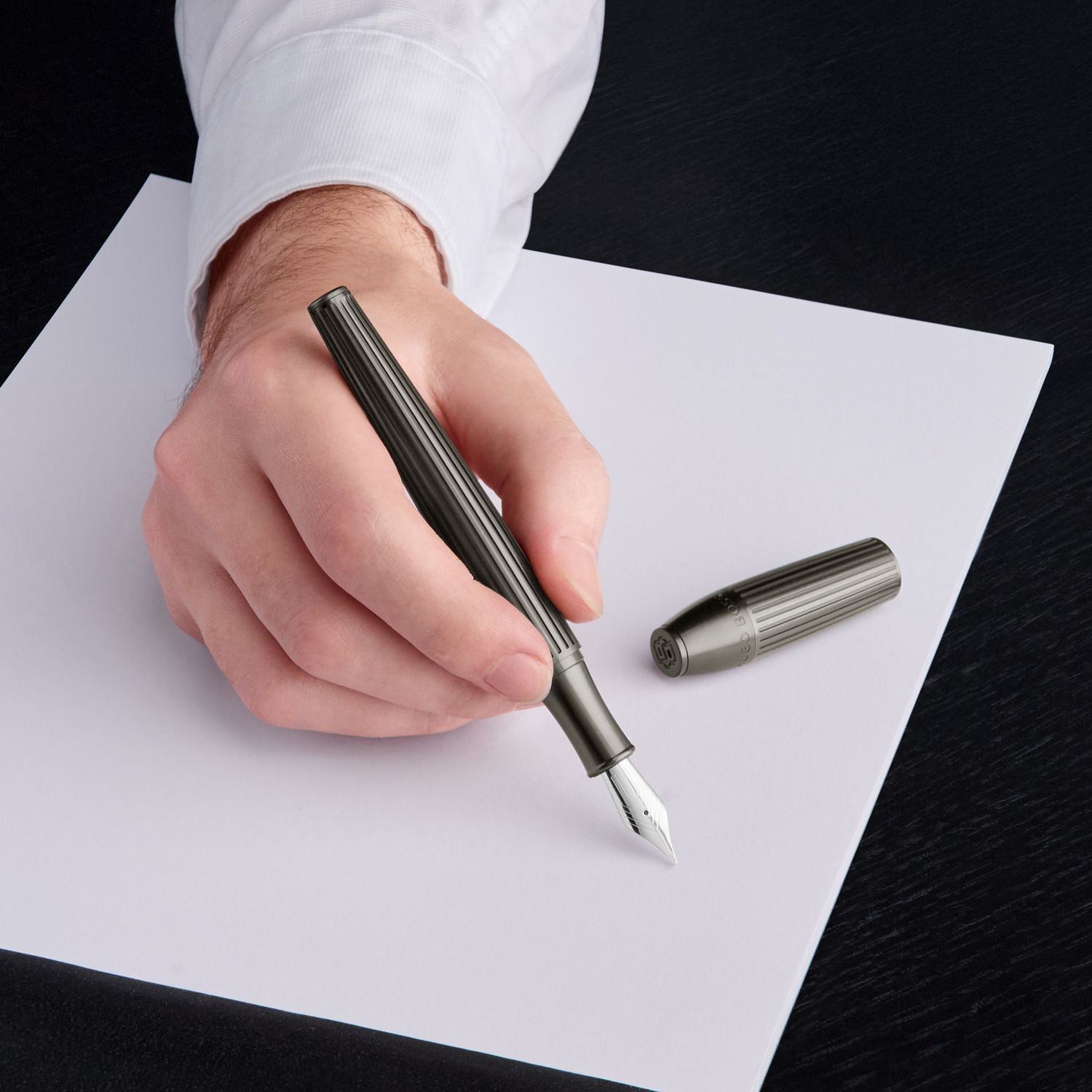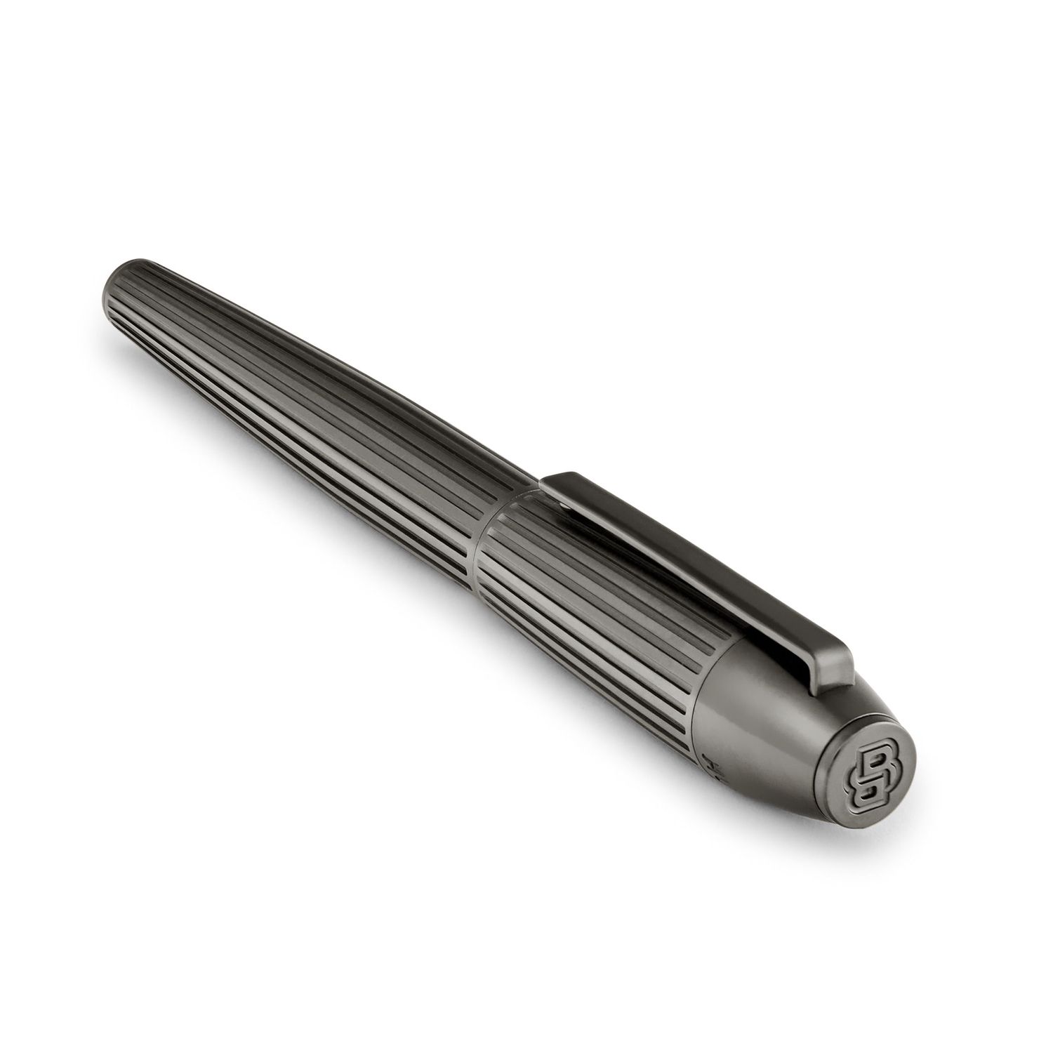 Ten kształt zapewnia idealną równowagę między siłą i elegancją, charakteryzując się głębokim, ponadwymiarowym wzorem w prążki. Pokryty luksusowym matowym odcieniem brązu, element emanuje minimalistycznym, ale skomplikowanym i wyrafinowanym charakterem. Skrupulatne rzemiosło i subtelne detale sprawiają, że jest on zarówno cenny, jak i dyskretny. Jego konstrukcja prezentuje odważną współczesną estetykę, co skutkuje uderzającym instrumentem piśmiennym.