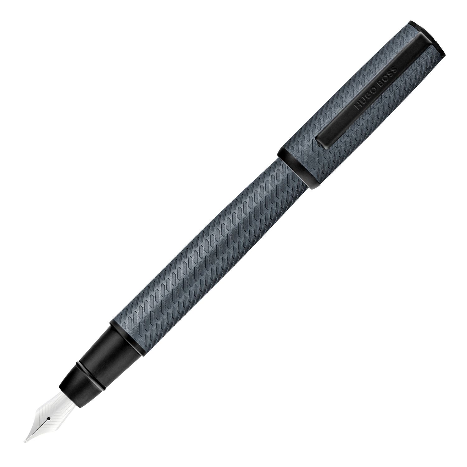 The Arche Pattern pen introduces a modern tapered silhouette, elevated by an innovative brushed-aluminum surface engraved with a pattern inspired by activewear mesh. Designed for a distinctly modern and innovative feel, it is finished in dark grey with black trims, a Double B signature at the top, and a clip adorned with the HUGO BOSS logo. The combination of technical texture and deep tones delivers a refined, futuristic expression.