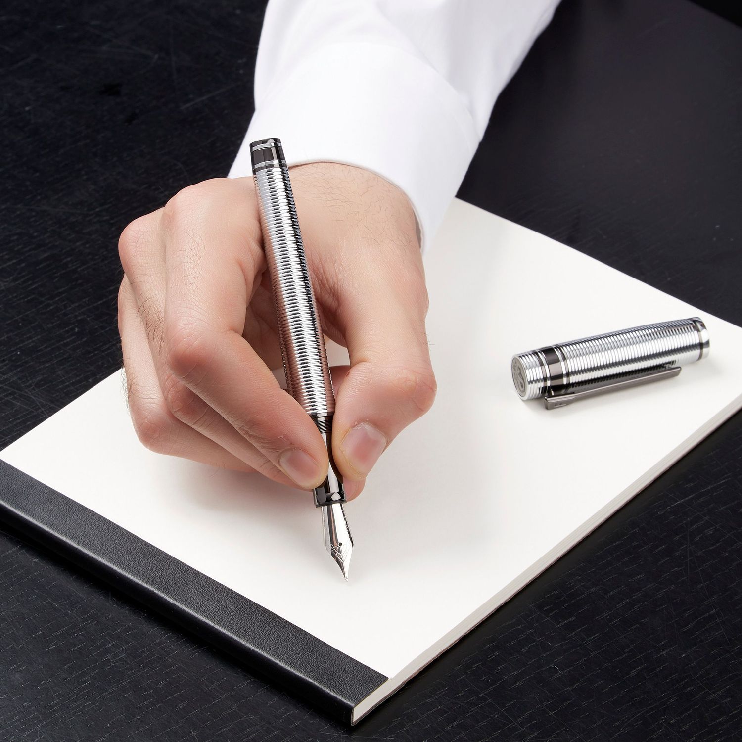 Nieco bardziej nieoczekiwana i wyrafinowana wersja naszej nowej kolekcji artykułów piśmiennych „Bold”, ten artykuł piśmienny jest w całości wygrawerowany w poziome paski. Ta część asortymentu jest deklaracją stylu i elegancji sama w sobie i jest oferowana w 3 luksusowych kolorach powłoki metalowej: czarnym, pistoletowym i chromowanym Luksusowym. Gra z kontrastującymi kolorami, wykończeniami i wyrafinowanymi detalami jest kluczem do naszego procesu projektowania. Każdy element subtelnie uzupełnia inny, dając efekt, który jest zarówno elegancki, jak i niewymuszony.