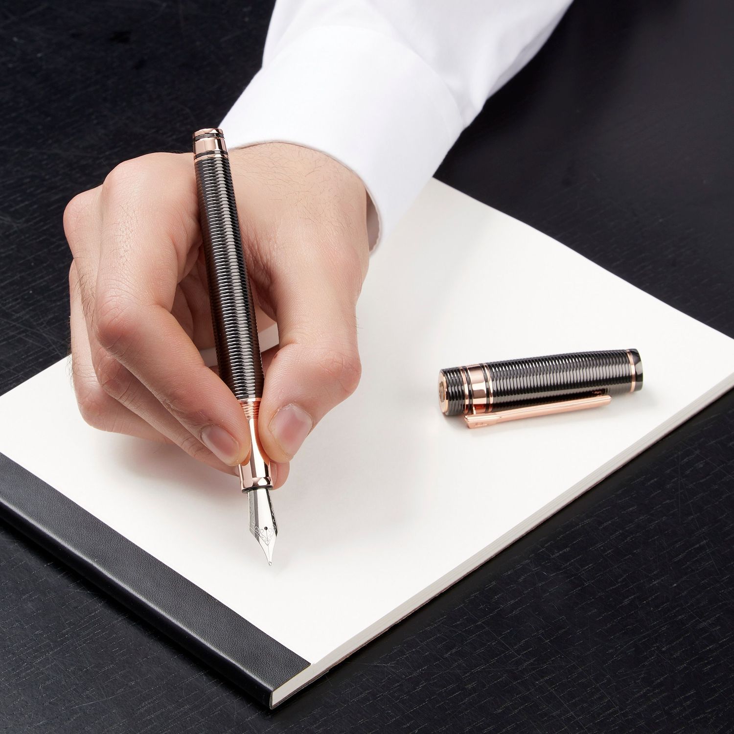 Nieco bardziej nieoczekiwana i wyrafinowana wersja naszej nowej kolekcji artykułów piśmiennych „Bold”, ten artykuł piśmienny jest w całości wygrawerowany w poziome paski. Ta część asortymentu jest deklaracją stylu i elegancji sama w sobie i jest oferowana w 3 luksusowych kolorach powłoki metalowej: czarnym, pistoletowym i chromowanym Luksusowym. Gra z kontrastującymi kolorami, wykończeniami i wyrafinowanymi detalami jest kluczem do naszego procesu projektowania. Każdy element subtelnie uzupełnia inny, dając efekt, który jest zarówno elegancki, jak i niewymuszony.