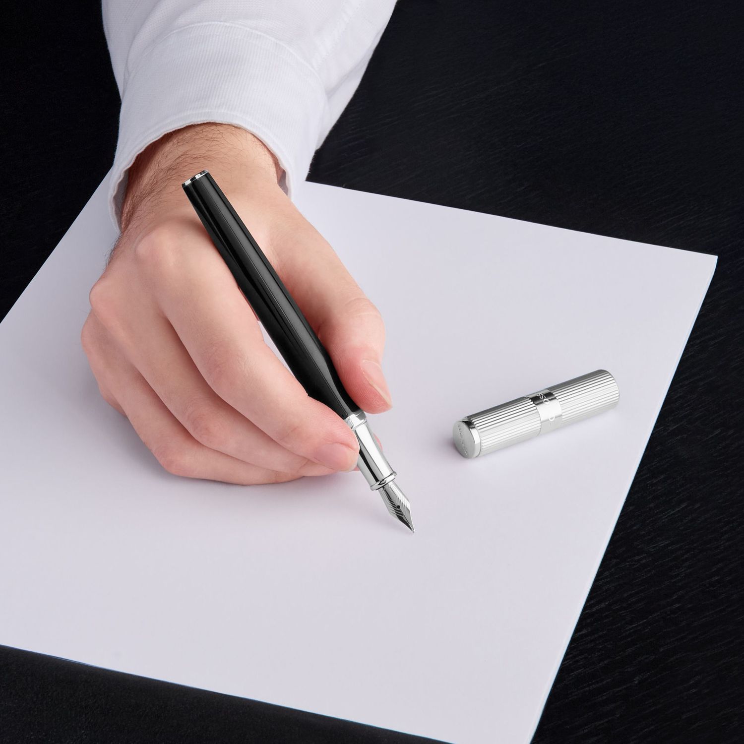 Introducing the HUGO BOSS Fountain Pen Formation Line Silver, a stunning blend of sophistication and style. Crafted from premium brass with a chic matte finish, this elegant pen is perfect for those who appreciate the art of writing. Its pastel grey and sleek black colors make it a versatile accessory for anyone, regardless of gender. Weighing just 47 grams and featuring a smooth blue ink cartridge, this pen glides effortlessly across the page, elevating your writing experience. A must-have for professionals and creatives alike, embrace luxury with every stroke.