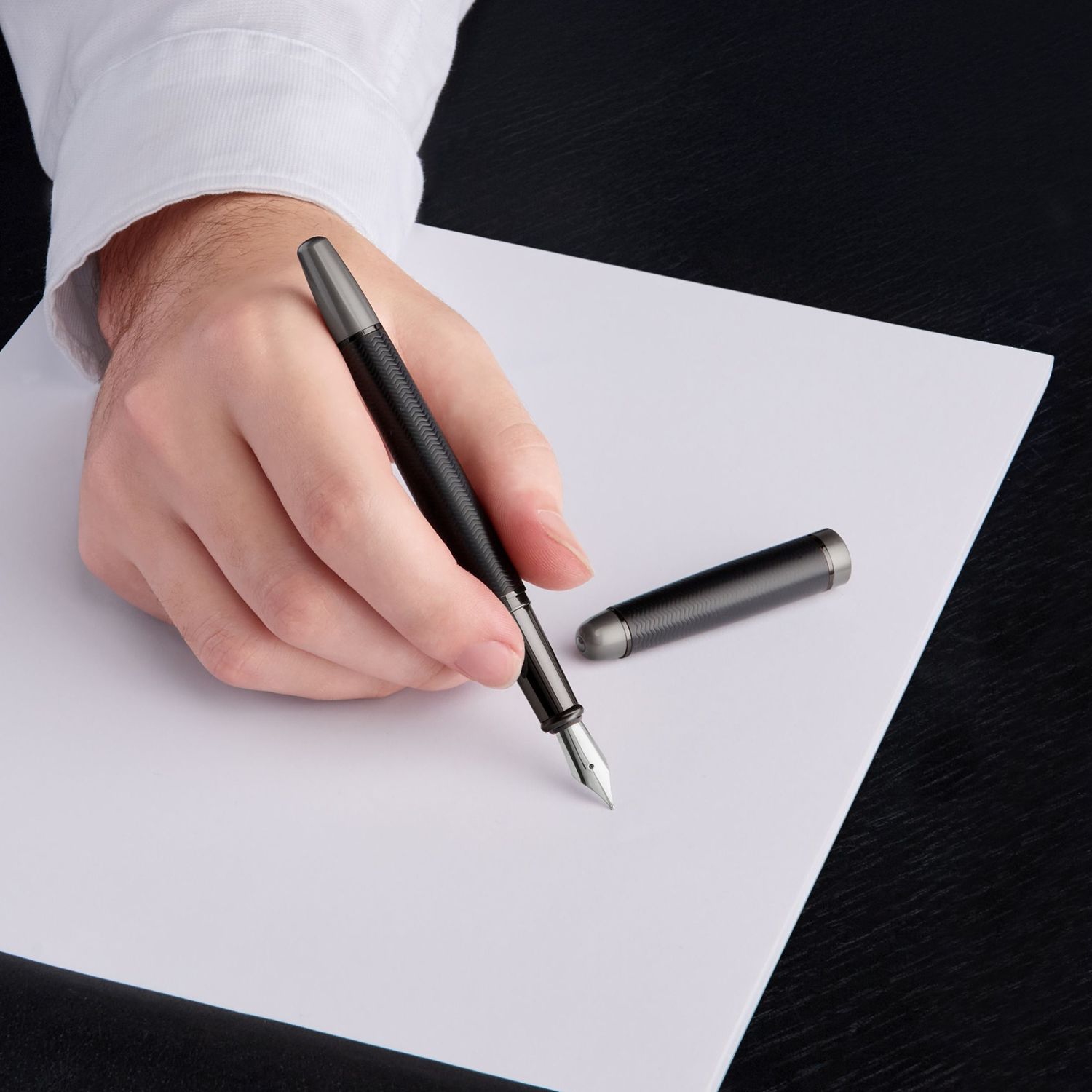 To klasyczne pióro wieczne, ozdobione szewronowym grawerem inspirowanym tytułową linią torebek, emanuje ponadczasowym wyrafinowaniem. Wykończenia z brązu i kontrastujący matowy i błyszczący pierścień środkowy podkreślają jego wyrafinowany design, oferując doskonałe wrażenia z pisania w przystępnej cenie.