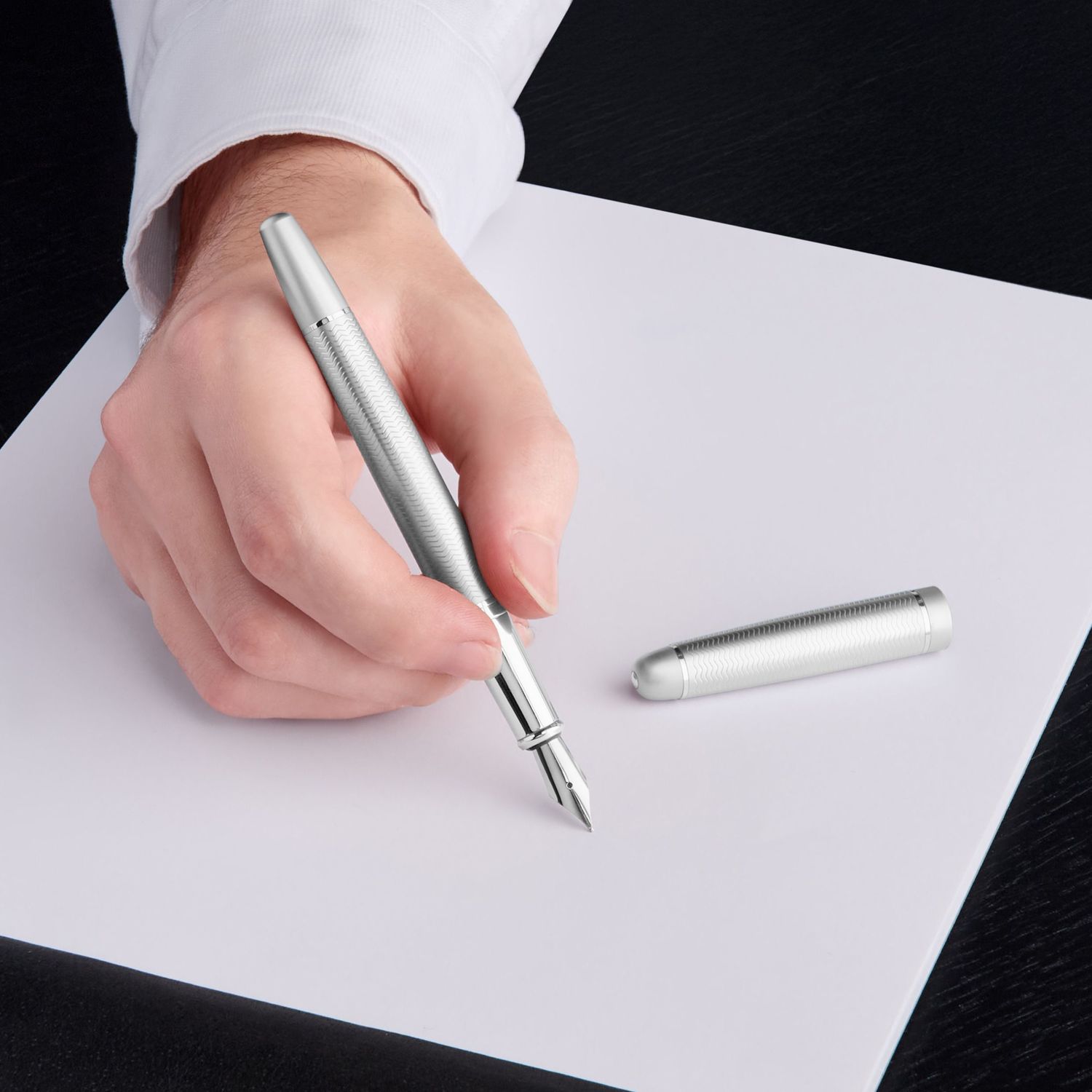To wykonane w całości ze srebra pióro wieczne o klasycznym kształcie, ozdobione szewronowym grawerem nawiązującym do tytułowej linii torebek, łączy w sobie ponadczasową elegancję z nowoczesną finezją. Kontrastujący matowy i błyszczący srebrny pierścień i wykończenia podkreślają jego wyrafinowanie, oferując najwyższą jakość w konkurencyjnej cenie.