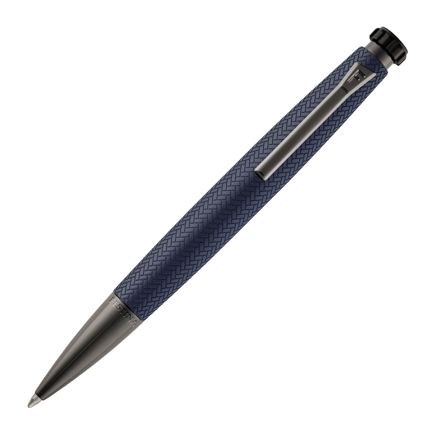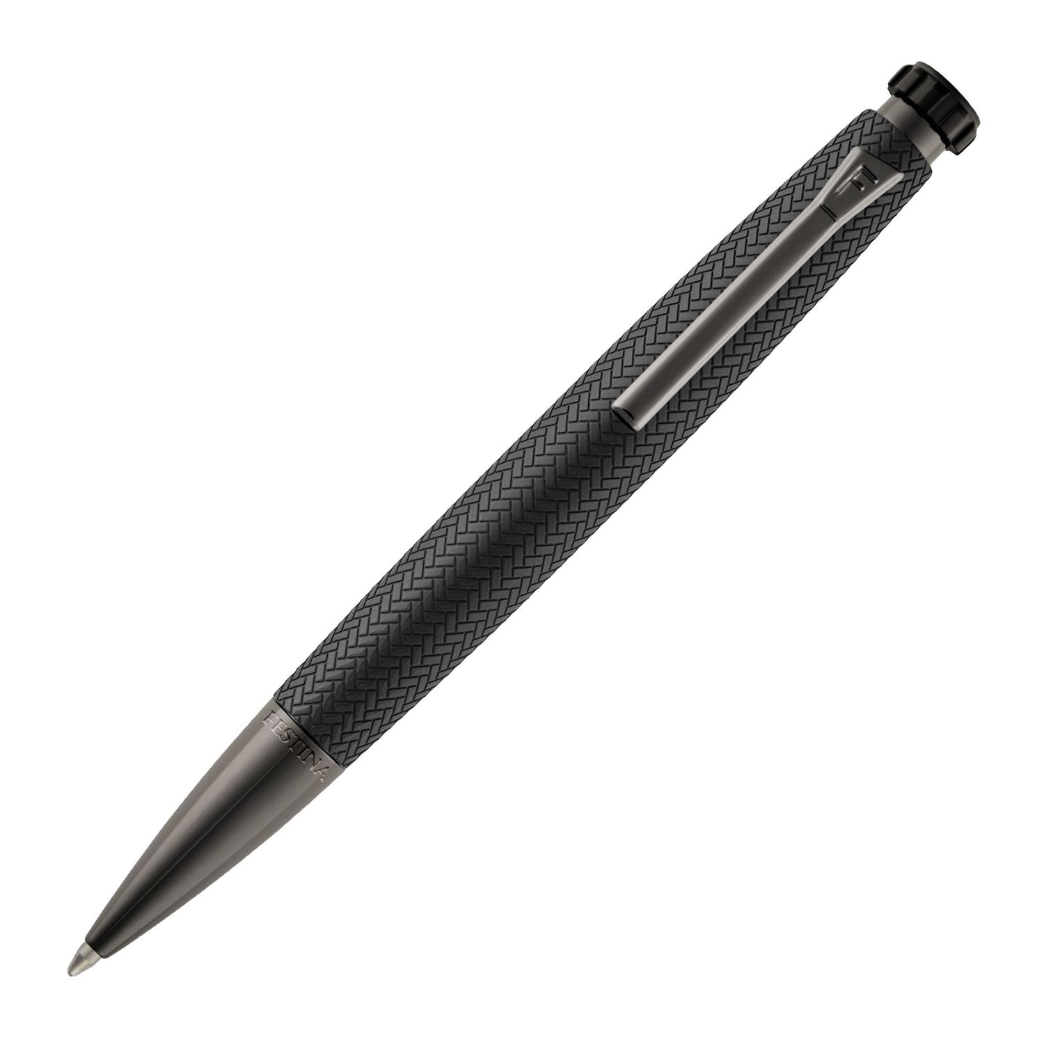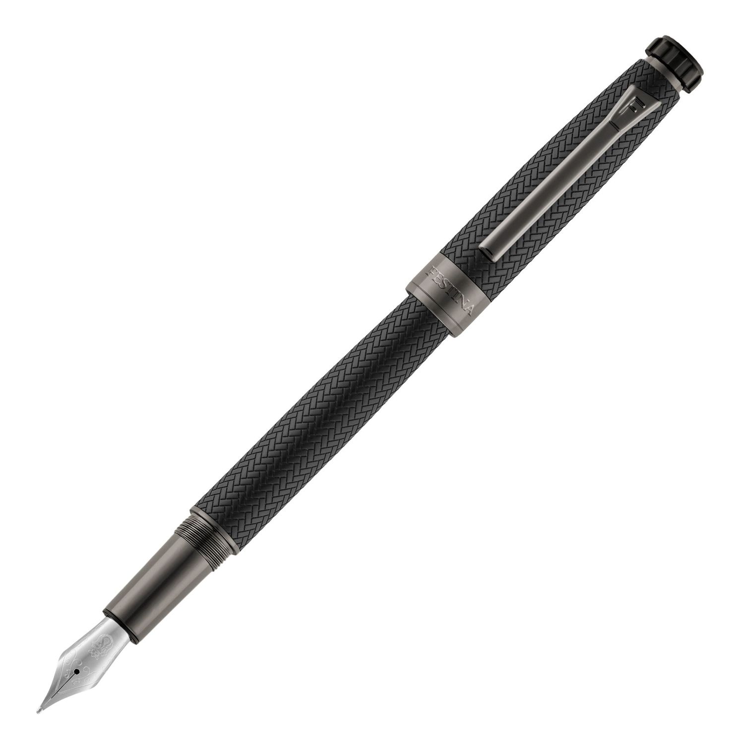 The Interlace fountain pen in black and gunmetal blends the best-selling Chronobike silhouette with a woven-inspired texture that adds depth and a distinctly modern sophistication. The tapered, aerodynamic shape introduces an active edge, while gunmetal trims and a finely executed nib enhance its luxurious presence. The engraved blazon atop the signature watch-inspired button anchors the design in Festina heritage. Understated in black and elevated with its textured finish, this fountain pen embodies a harmonious balance of refinement and performance.