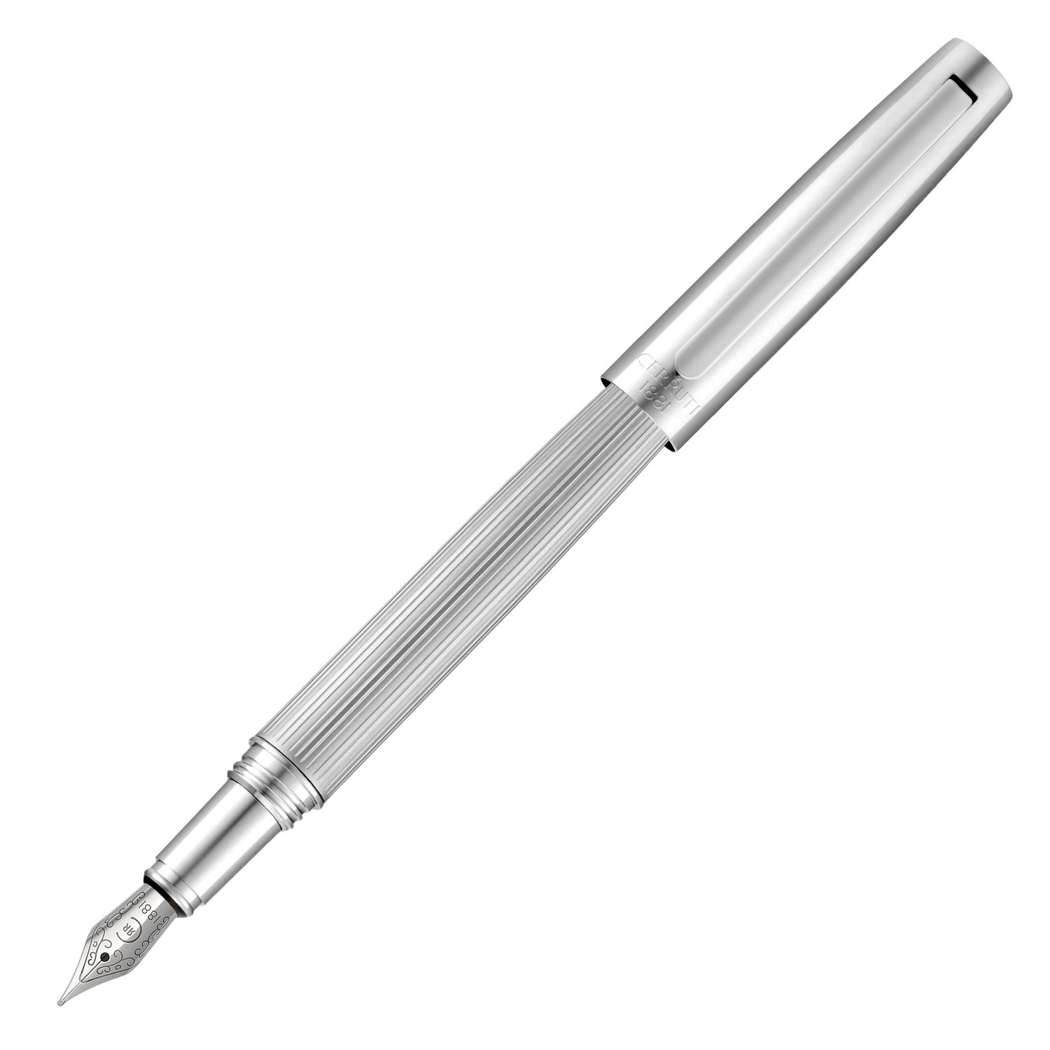 The Cerruti 1881 chrome fountain pen is defined by luxurious minimalism, featuring a smooth cap engraved with the new two-row Cerruti 1881 logo, contrasted by a pinstripe-engraved lower barrel. Executed in crisp, timeless chrome, it offers a refined expression of classical writing with a modern edge.
