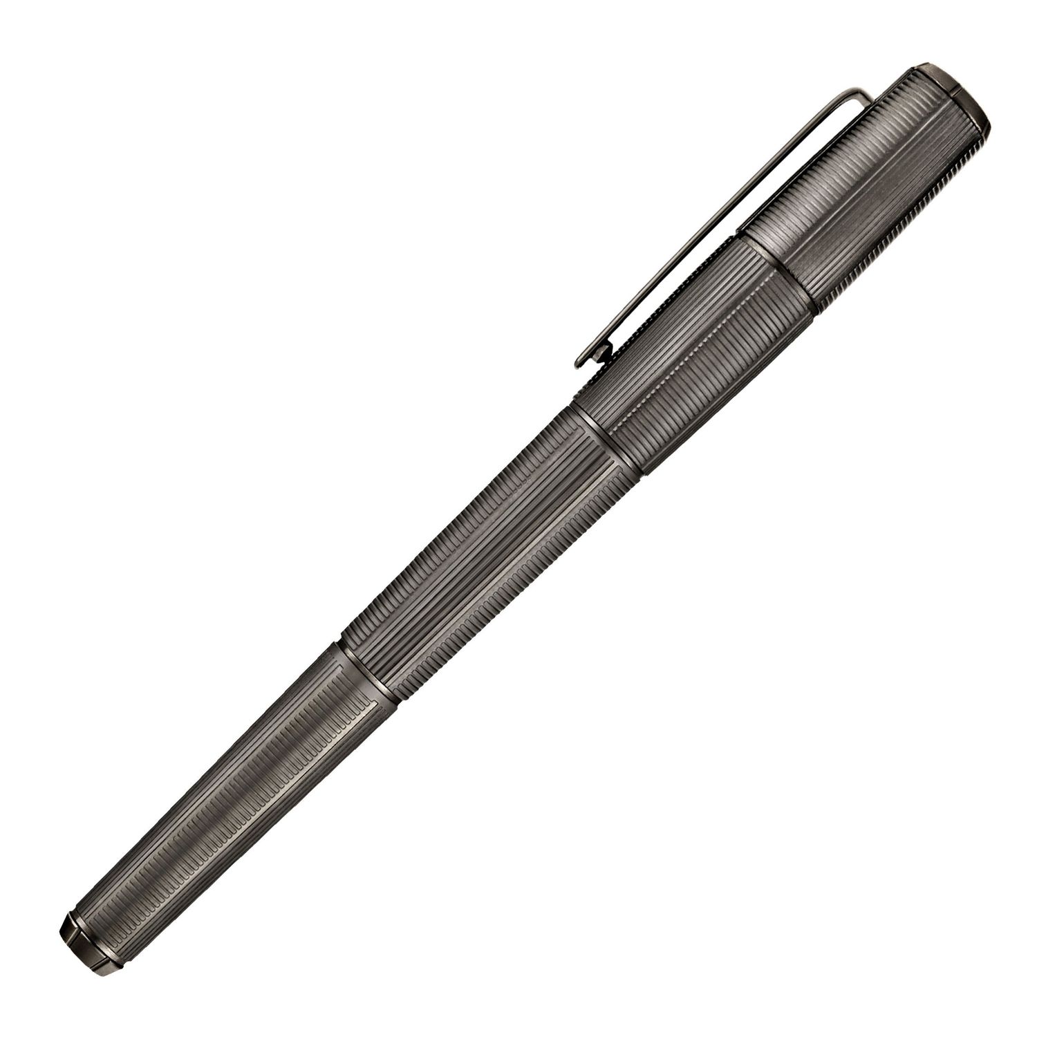 The Meridien pen reveals a futuristic, angular silhouette defined by a precise sequence of vertical and horizontal deep-engraved stripes. This graphic interplay forms a modern interpretation of the timeless herringbone pattern, giving the pen a sense of movement and structure. The minimal matte gunmetal plating reinforces its clean geometry, resulting in a piece that feels confidently modern and distinctly architectural.