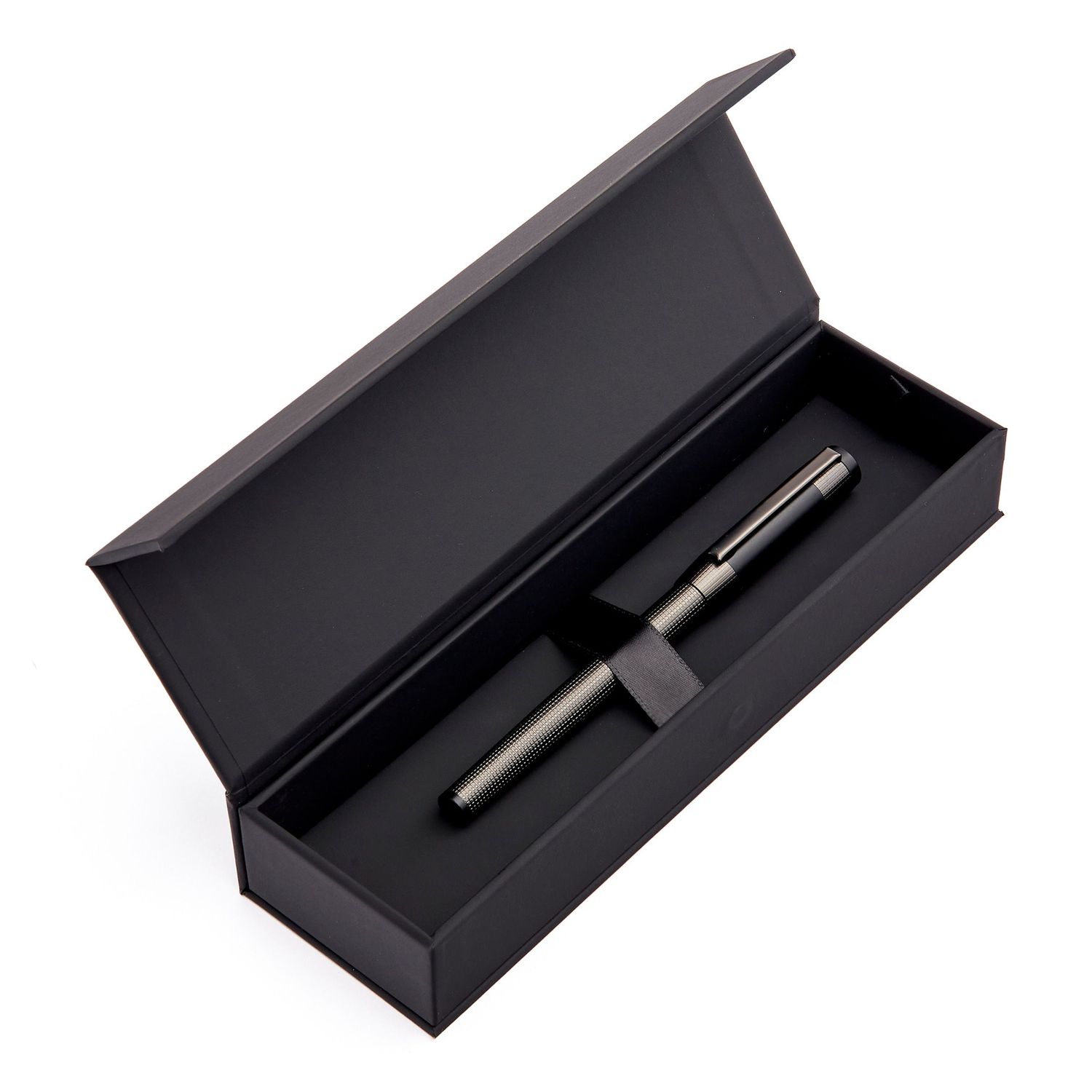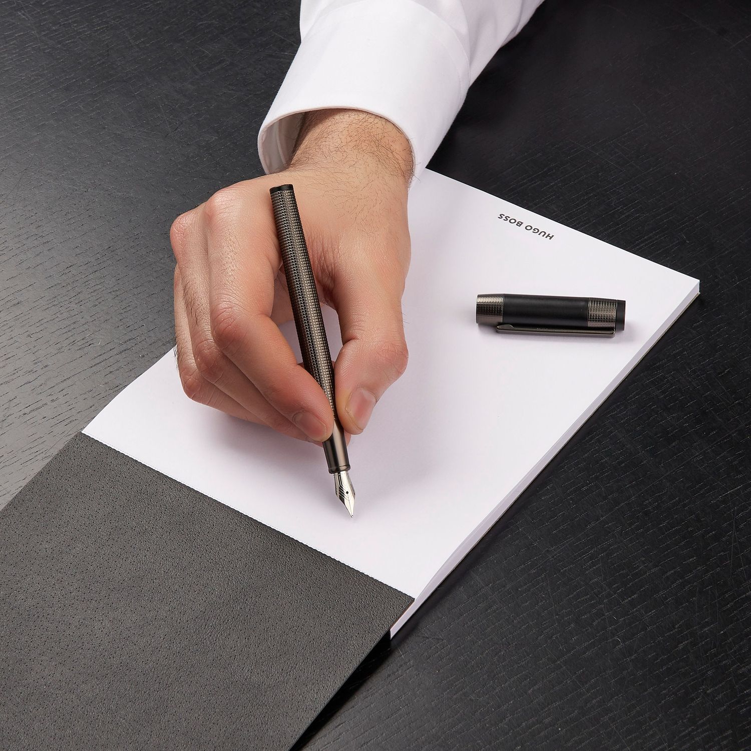 Zbudowane na smukłej, ale mocnej konstrukcji, długopisy Rive są zdefiniowane przez symetryczne elementy projektu i kontrastujące tekstury. Graficzna powierzchnia grawerowana w siatkę, pokryta matowym brązem, dodatkowo podkreśla nieoczekiwane linie, podczas gdy lekko powiększone logo jest wytłoczone na czarnym matowym lakierze.