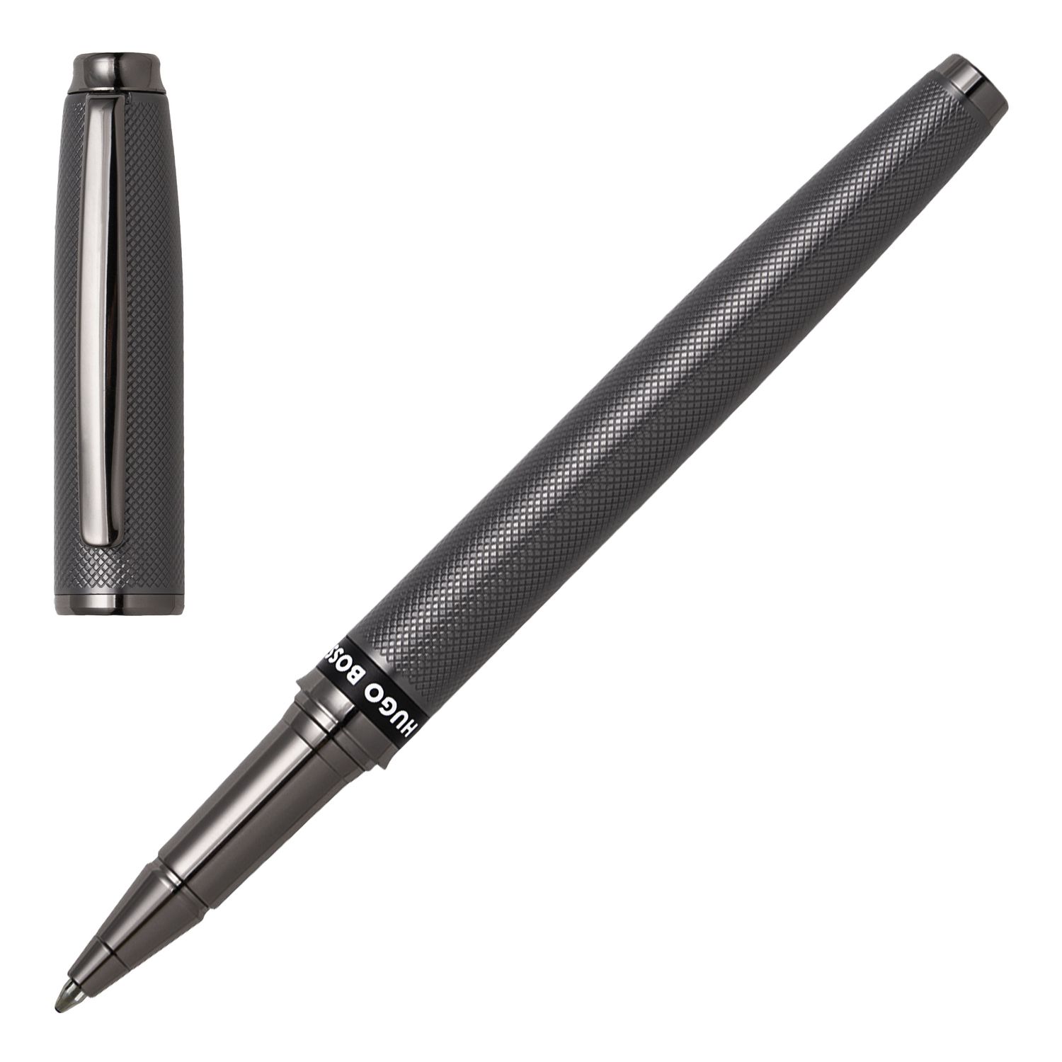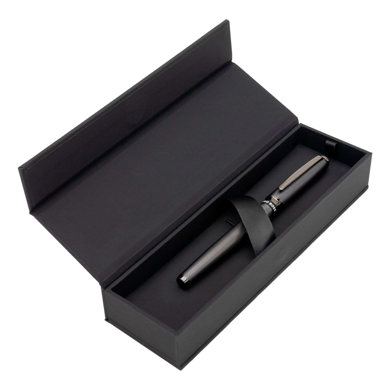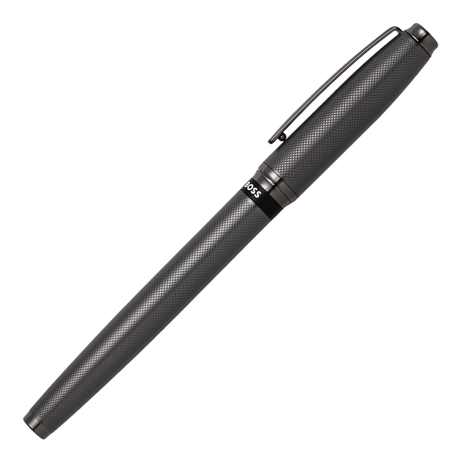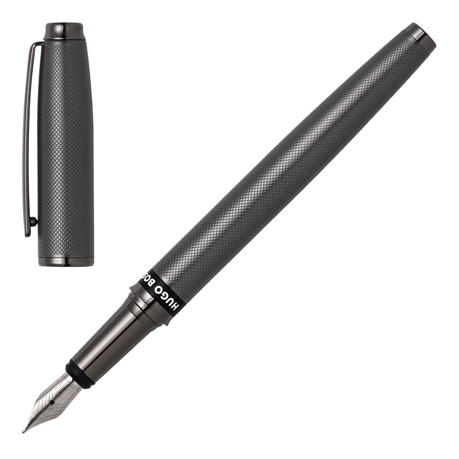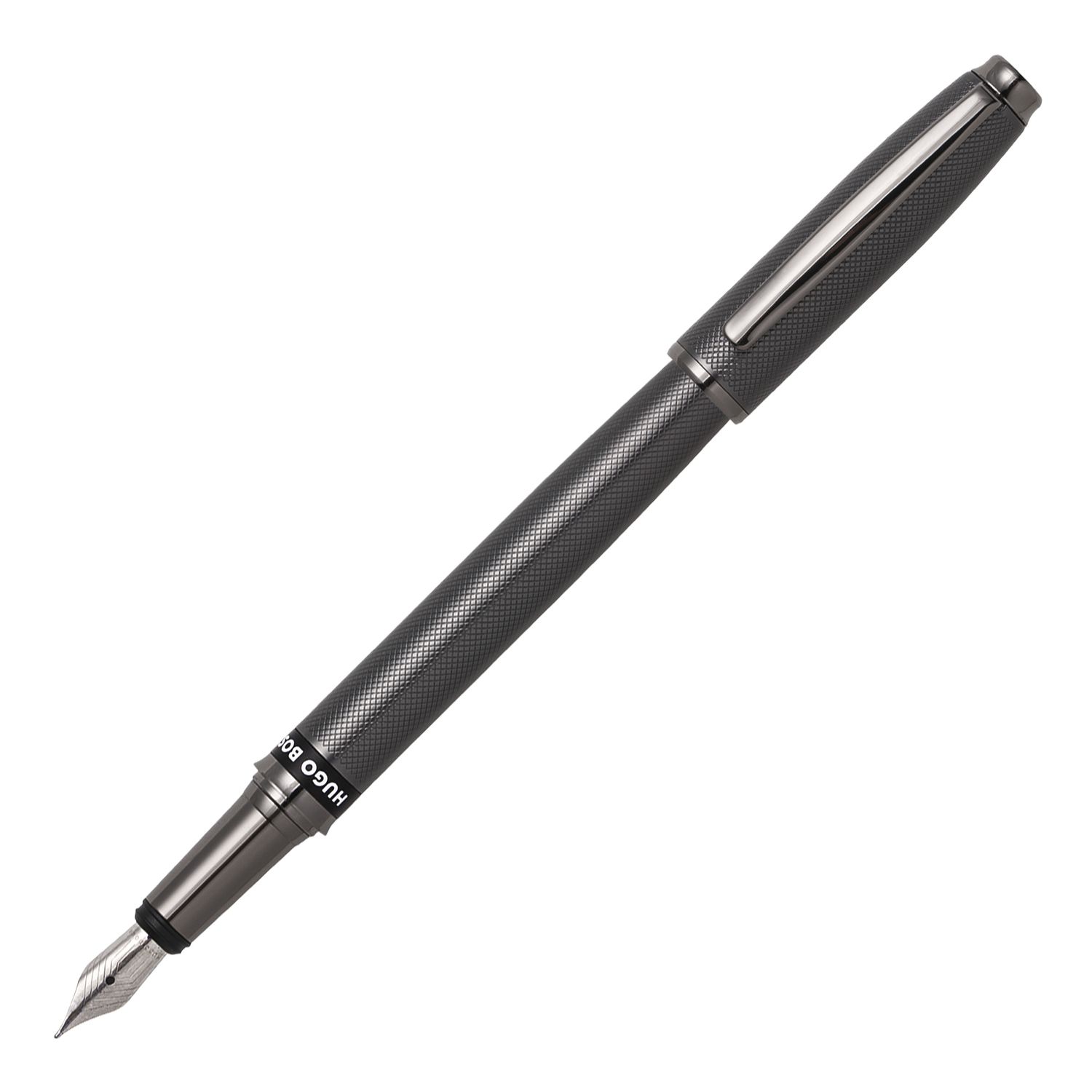 The Stream fountain pen is a sleek and modern writing instrument designed to provide a balanced writing experience. It features a new silhouette that combines simplicity and modernity. The pen is adorned with an engraved pattern that is plated in a luxurious matte gunmetal finish, providing an elevated haptic sensation. The black and white logo ring adds a touch of playful graphical element to the design. Offered in a luxurious fully recyclable, black packaging.