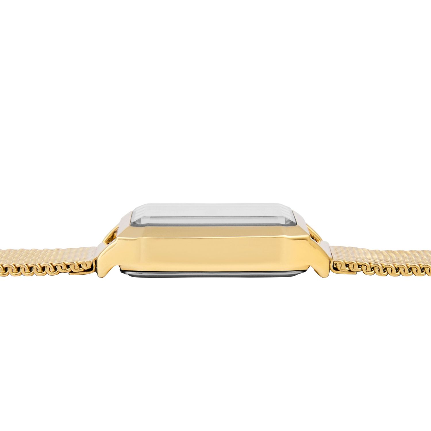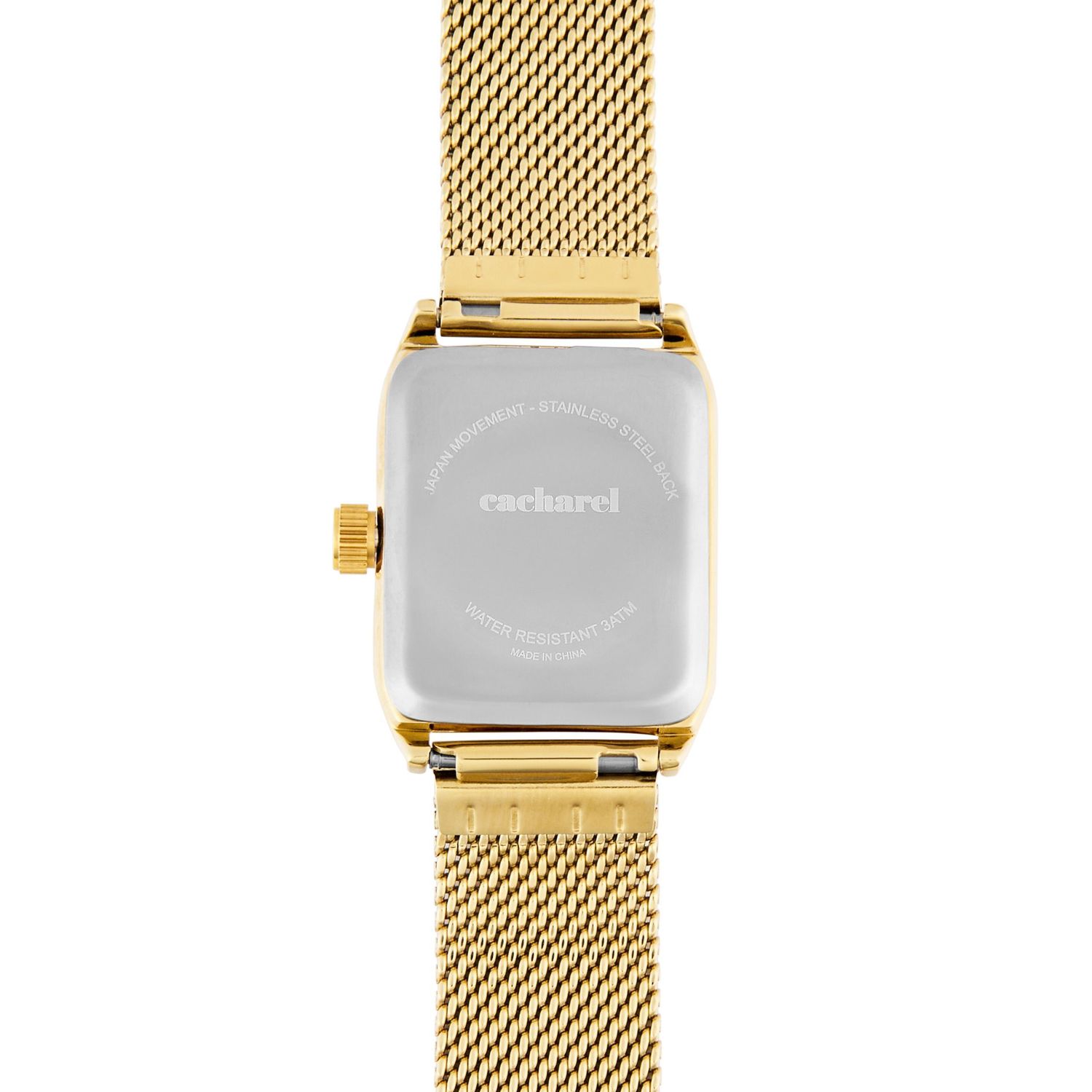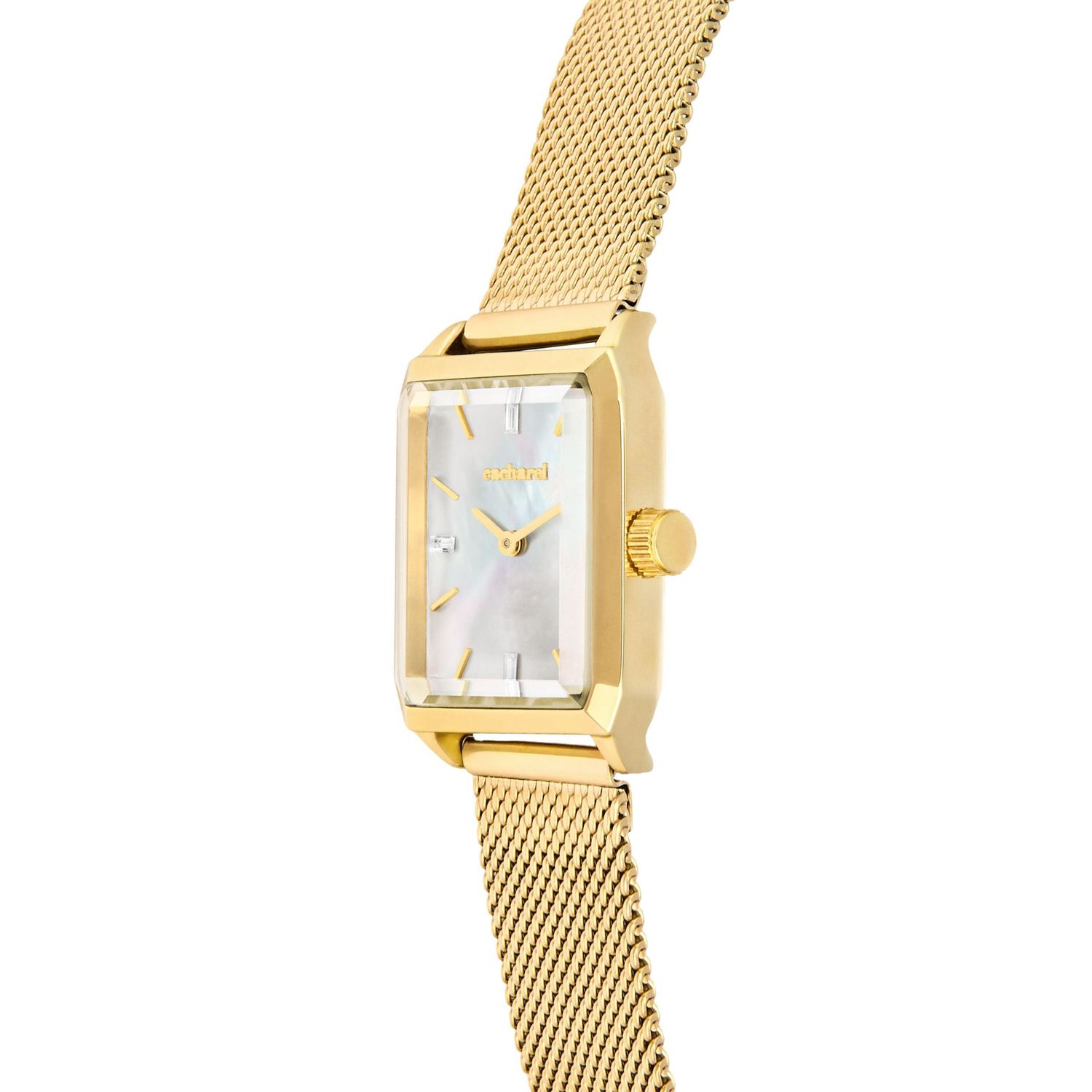 The Philomène watch in gold features a refined Milanese mesh bracelet paired with a crisp gold case, creating a sleek and timeless silhouette. Its mother-of-pearl dial is detailed entirely in gold, with a single stone adding a subtle hint of light. With its perfectly proportioned angular case, it offers an elegant and enduring sense of style.