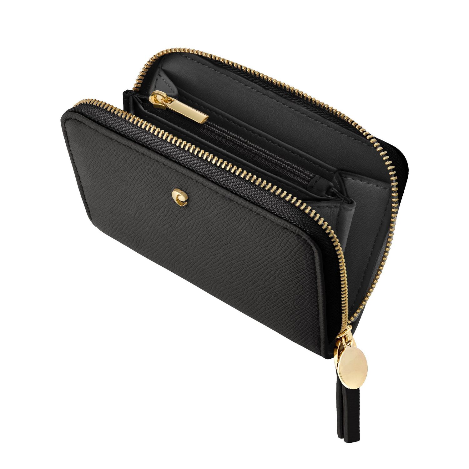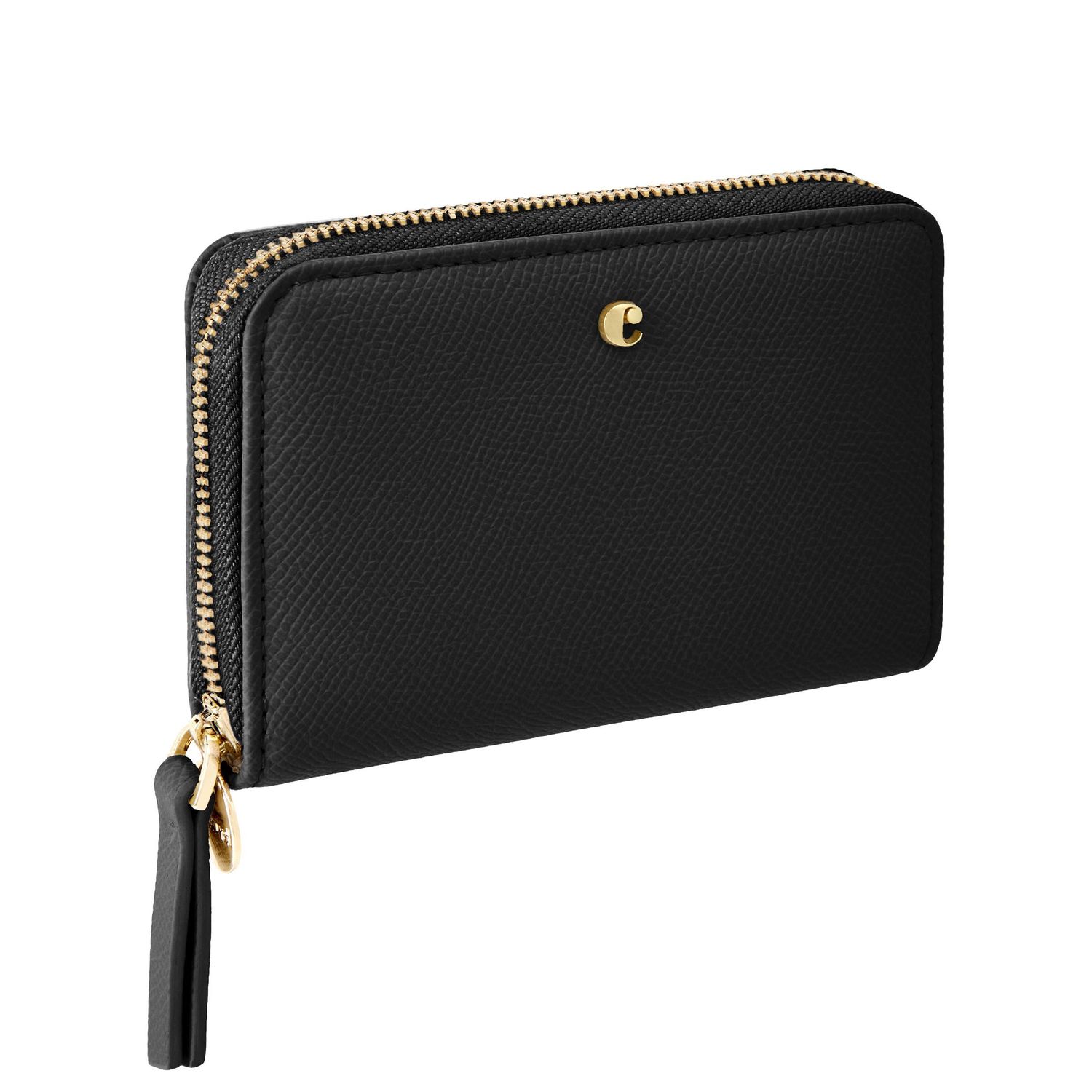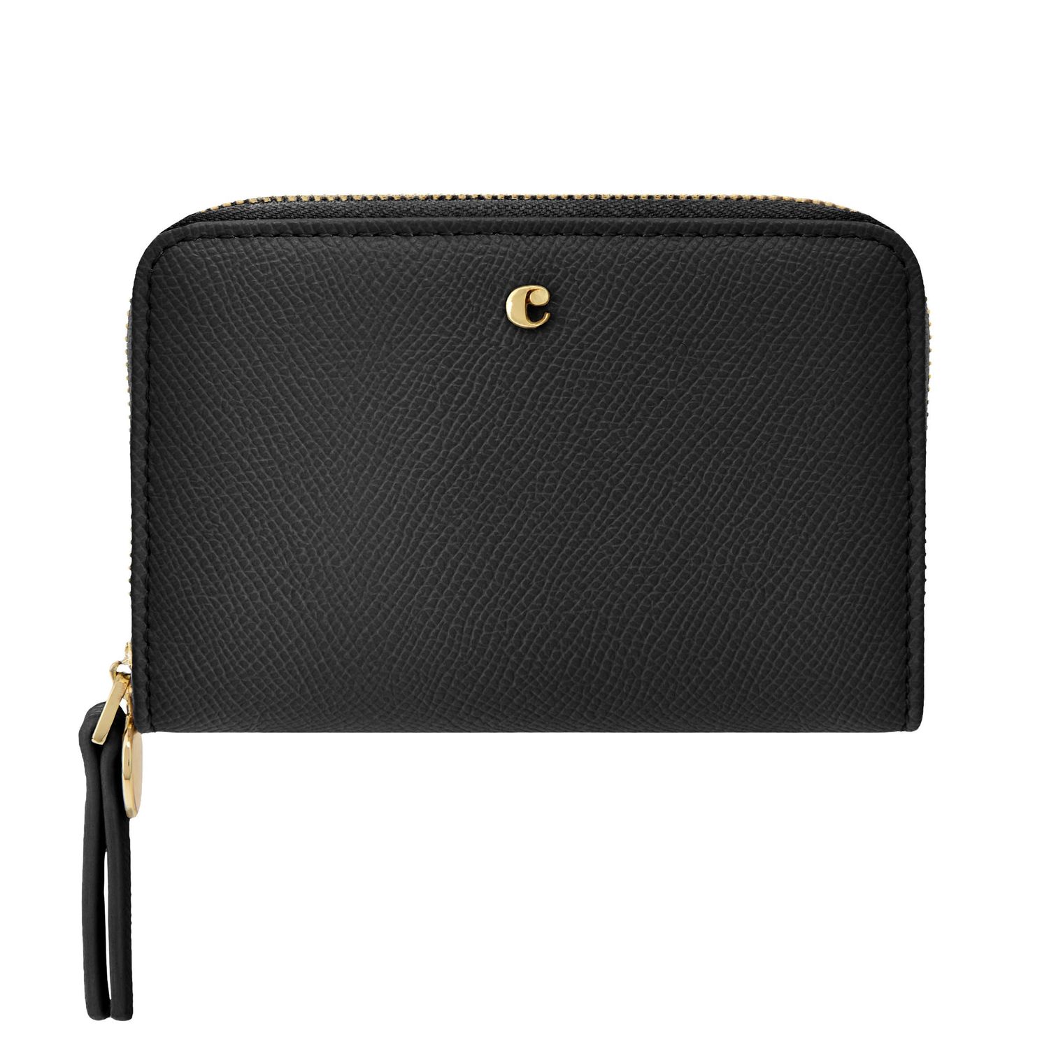 The Seraphine compact wallet blends practicality with refined style. Made from saffiano-textured vegan leather in a luxurious matte finish, it features a gold-toned C plate on the front and a matching metal plate on the zipper puller. Its compact format opens to a well-organized interior with four card slots and a zipped compartment, making it both functional and elegant for everyday use. Available in taupe, black, and light grey.