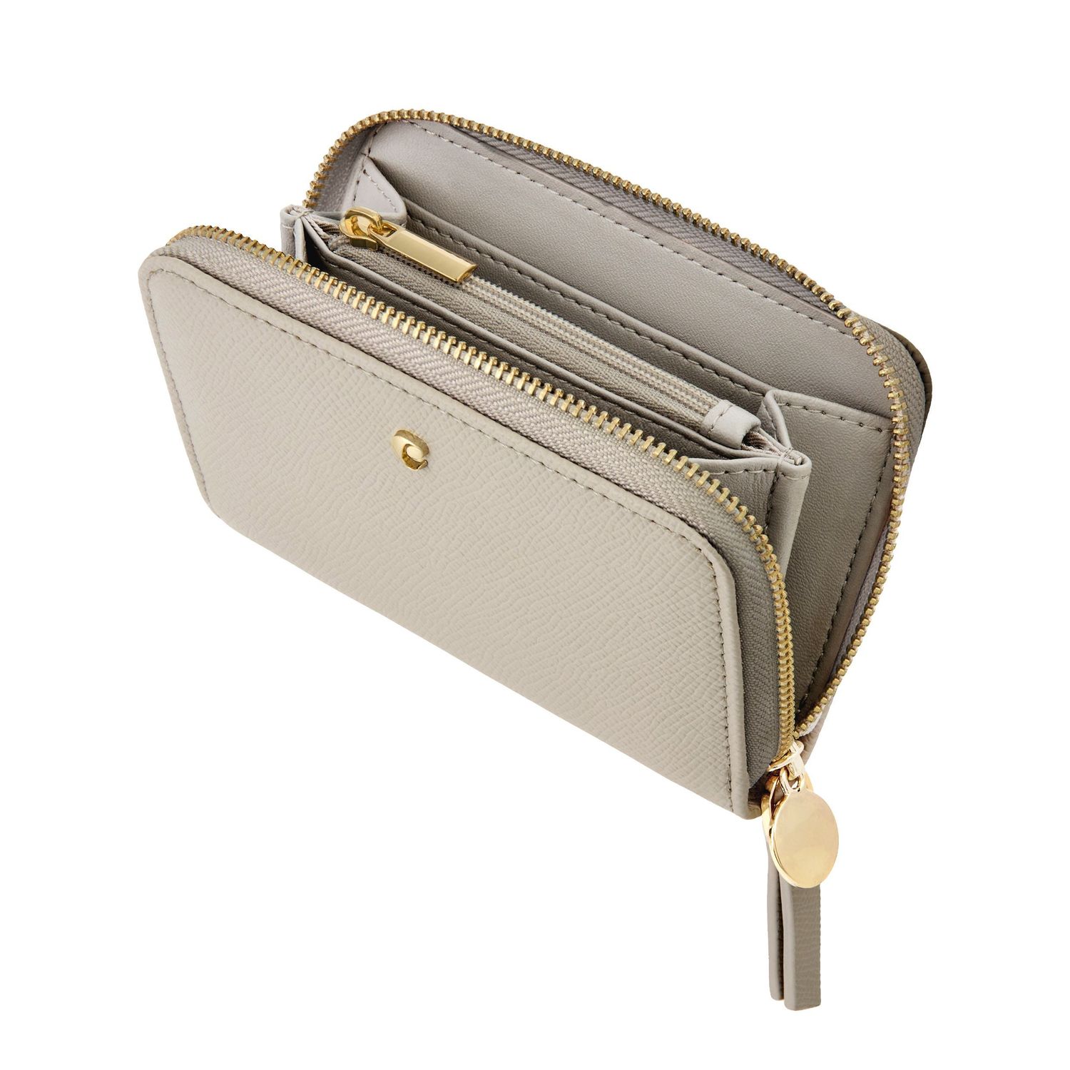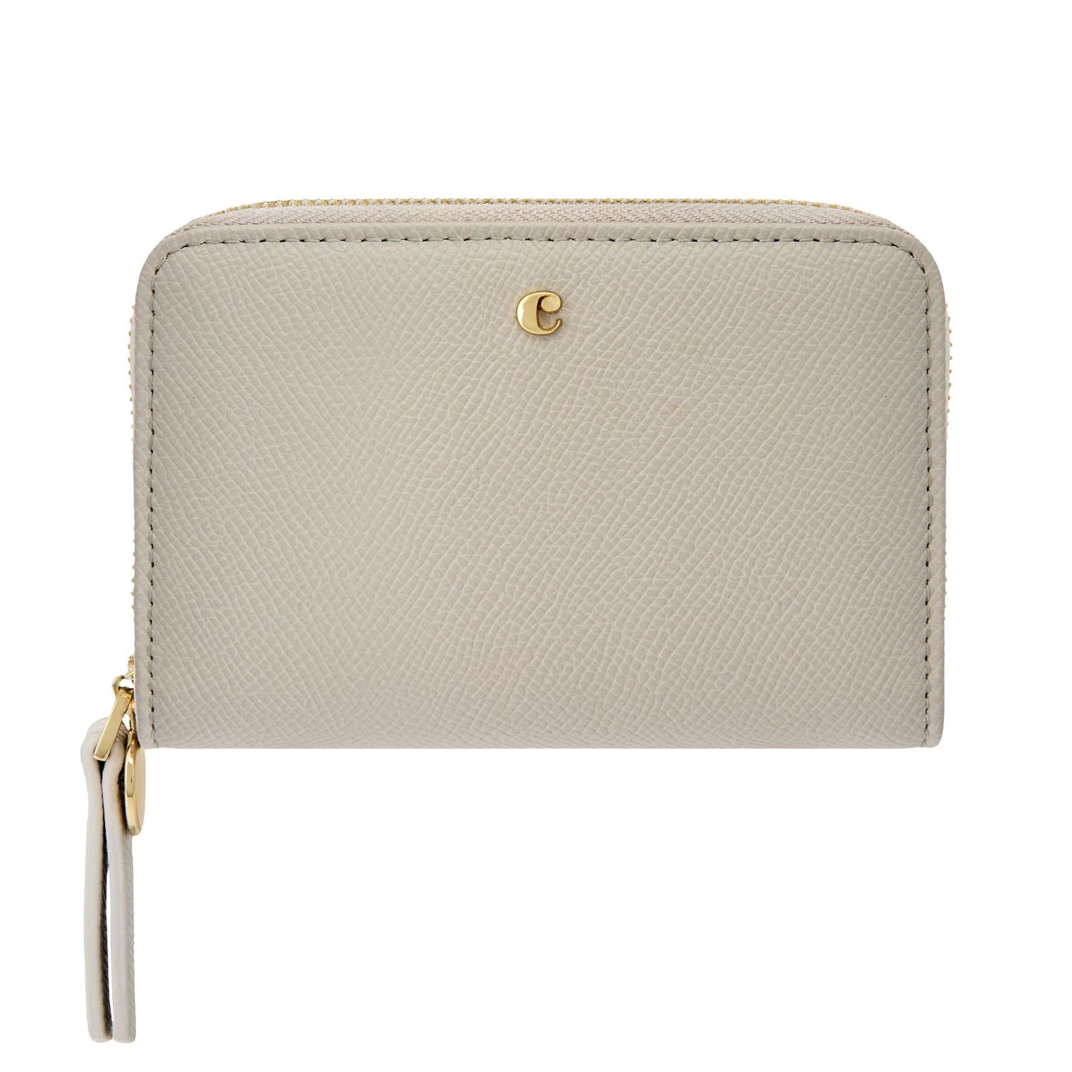 The Seraphine compact wallet blends practicality with refined style. Made from saffiano-textured vegan leather in a luxurious matte finish, it features a gold-toned C plate on the front and a matching metal plate on the zipper puller. Its compact format opens to a well-organized interior with four card slots and a zipped compartment, making it both functional and elegant for everyday use. Available in taupe, black, and light grey.